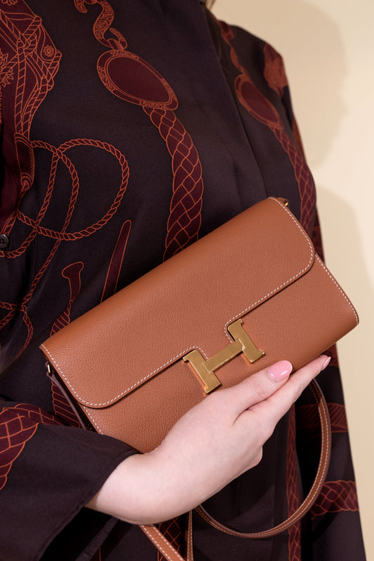 فستان قميص "Les Tambours Finesse" من Hermès بفتحات، مع محفظة Constance بلون ذهبي من Evercolor