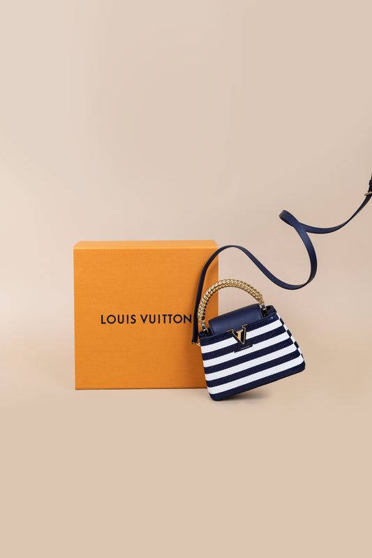 حقيبة لويس فيتون ميني كابوسين مخططة باللونين الأبيض والأزرق