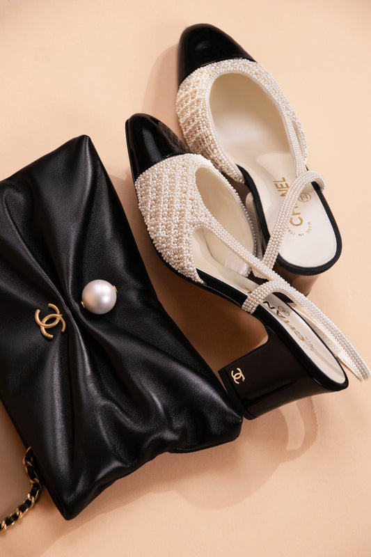 Chanel Black Clutch with Chain & Pearl Embroidered Slingbacks