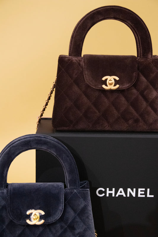 Chanel Kelly Nano Velvet Bags in Brown & Navy