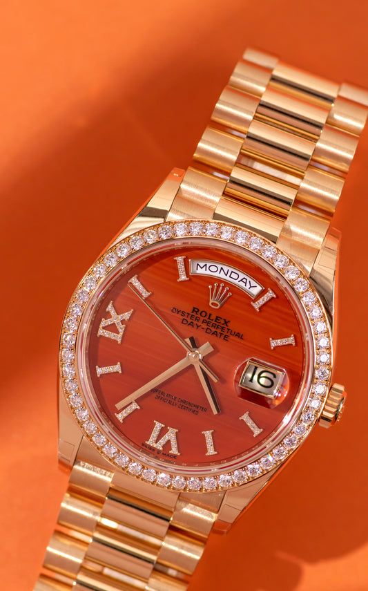 ساعة رولكس أويستر بربتشوال داي ديت بمينا برتقالية مرصعة بالألماس مقاس 36 مم