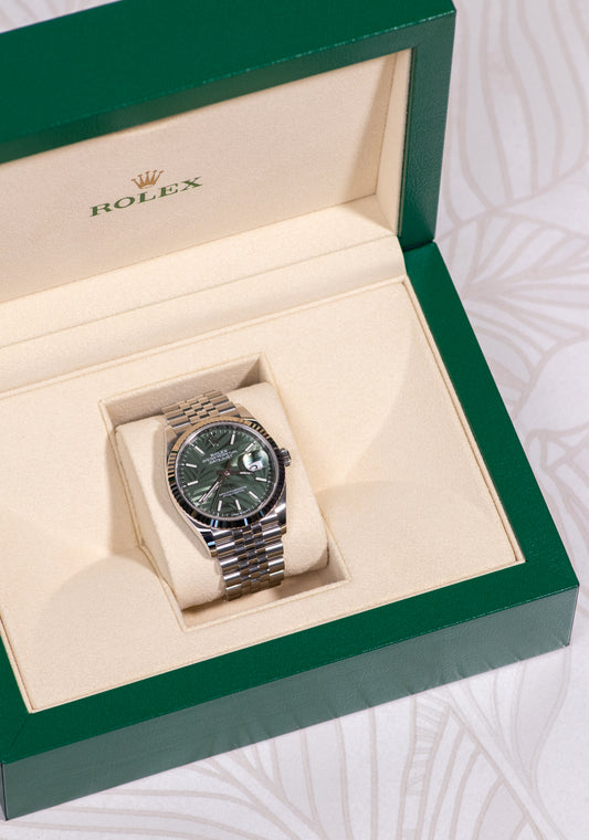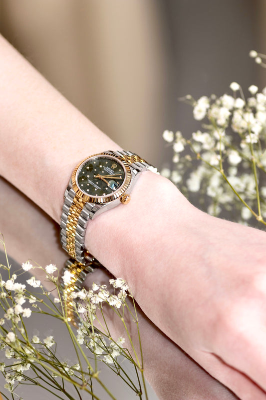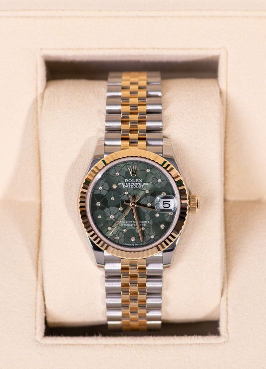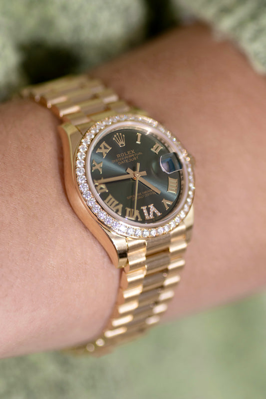 ساعة رولكس أويستر بربتشوال ديت جست، 31 مم، مينا من الذهب الأصفر/الألماس الأخضر الزيتوني