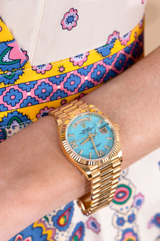 ساعة رولكس داي ديت من الذهب الأصفر بقطر 36 مم مع ميناء فيروزي