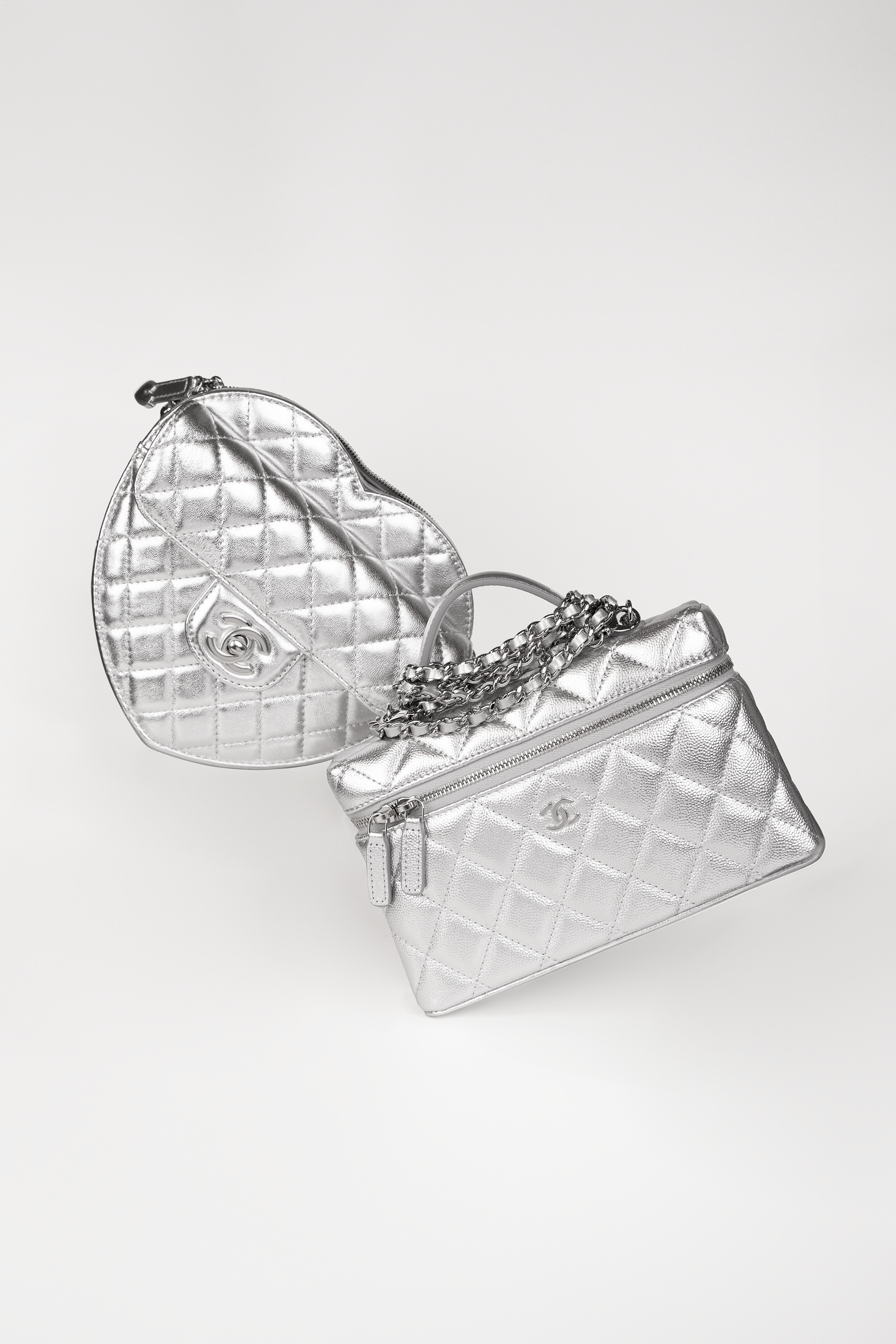 Chanel Silver Metallic Heart Bag & Vanity Case with Chain