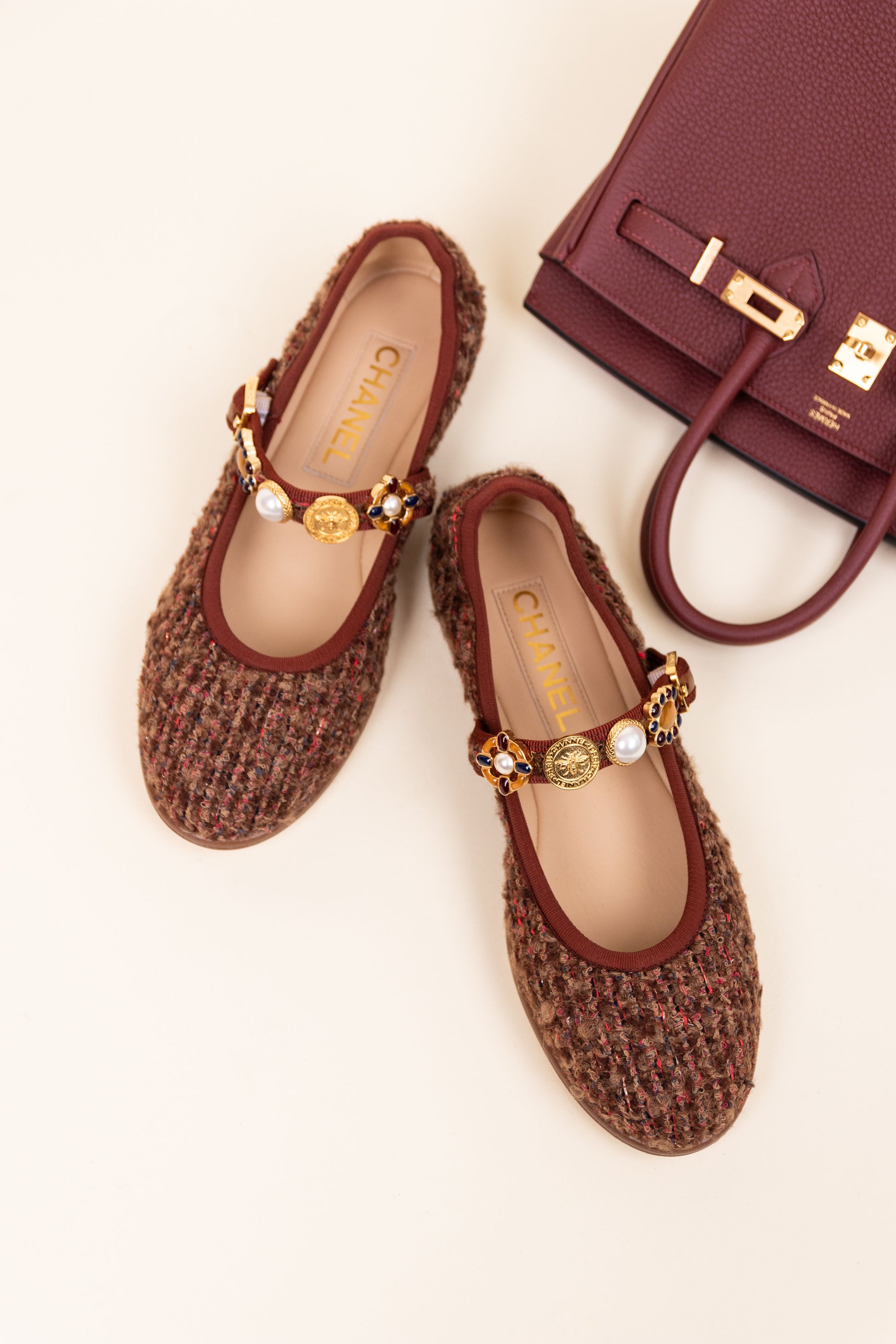 حذاء شانيل تويد ماري جين باللون البني/الأحمر