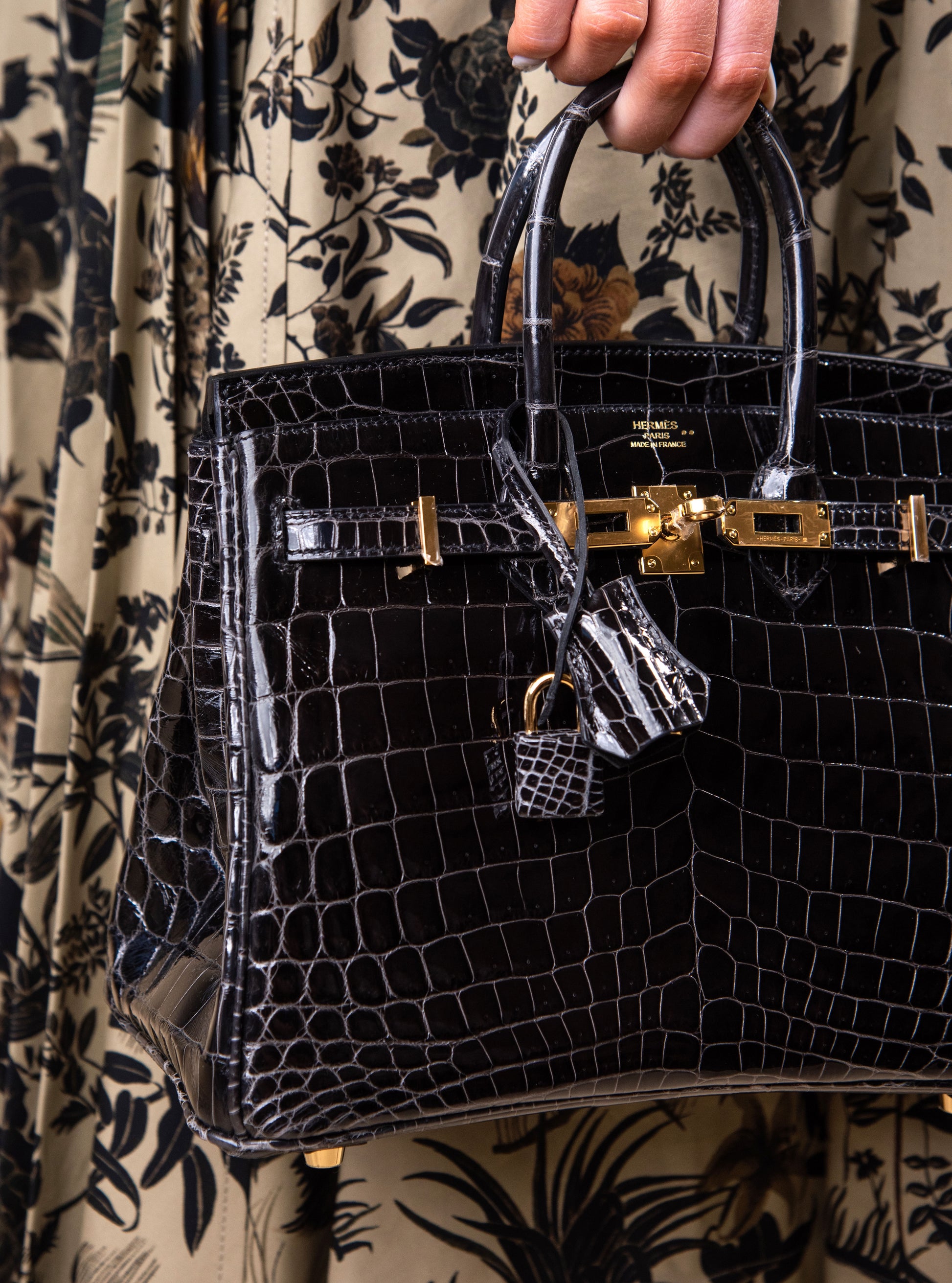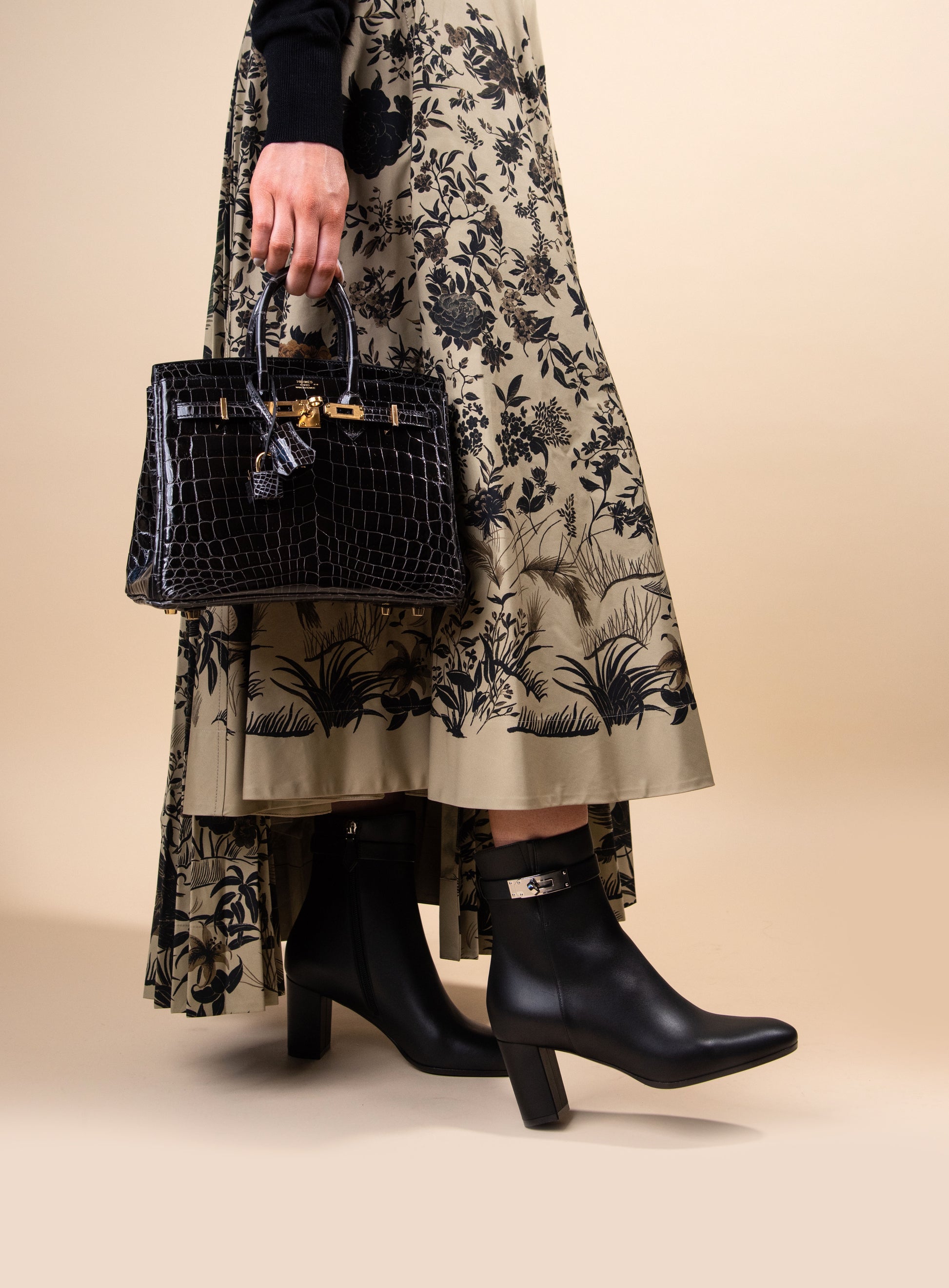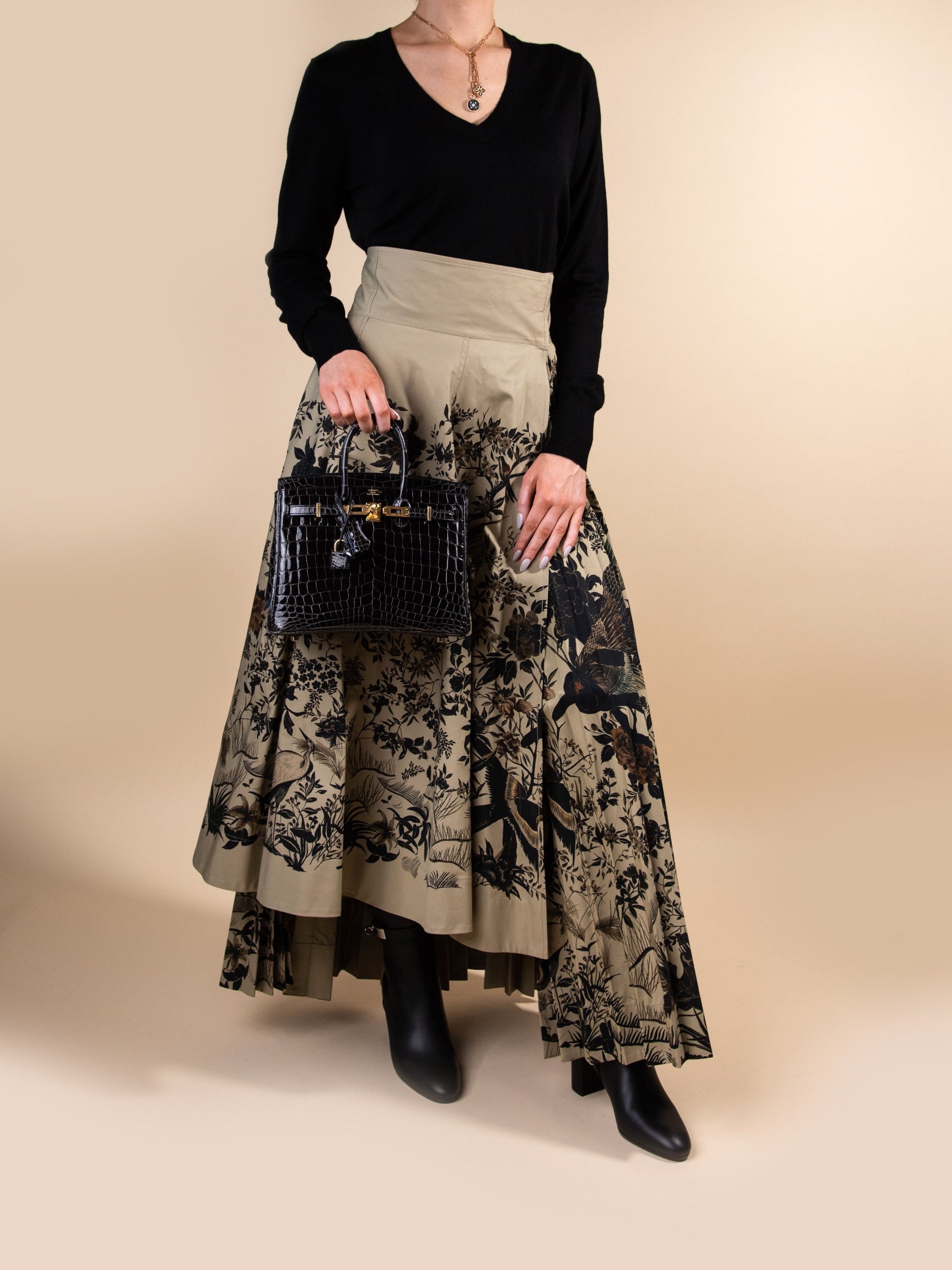 تنورة ديور طويلة غير متماثلة باللون البيج مع حقيبة هيرميس بيركين 25 بلون جلد التمساح الجرافيتي اللامع