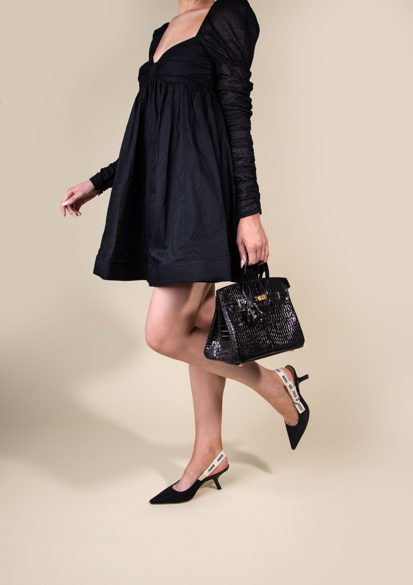 حذاء ديور جادور الأسود المفتوح من الخلف مع حقيبة بيركين 25 اللامعة من هيرميس
