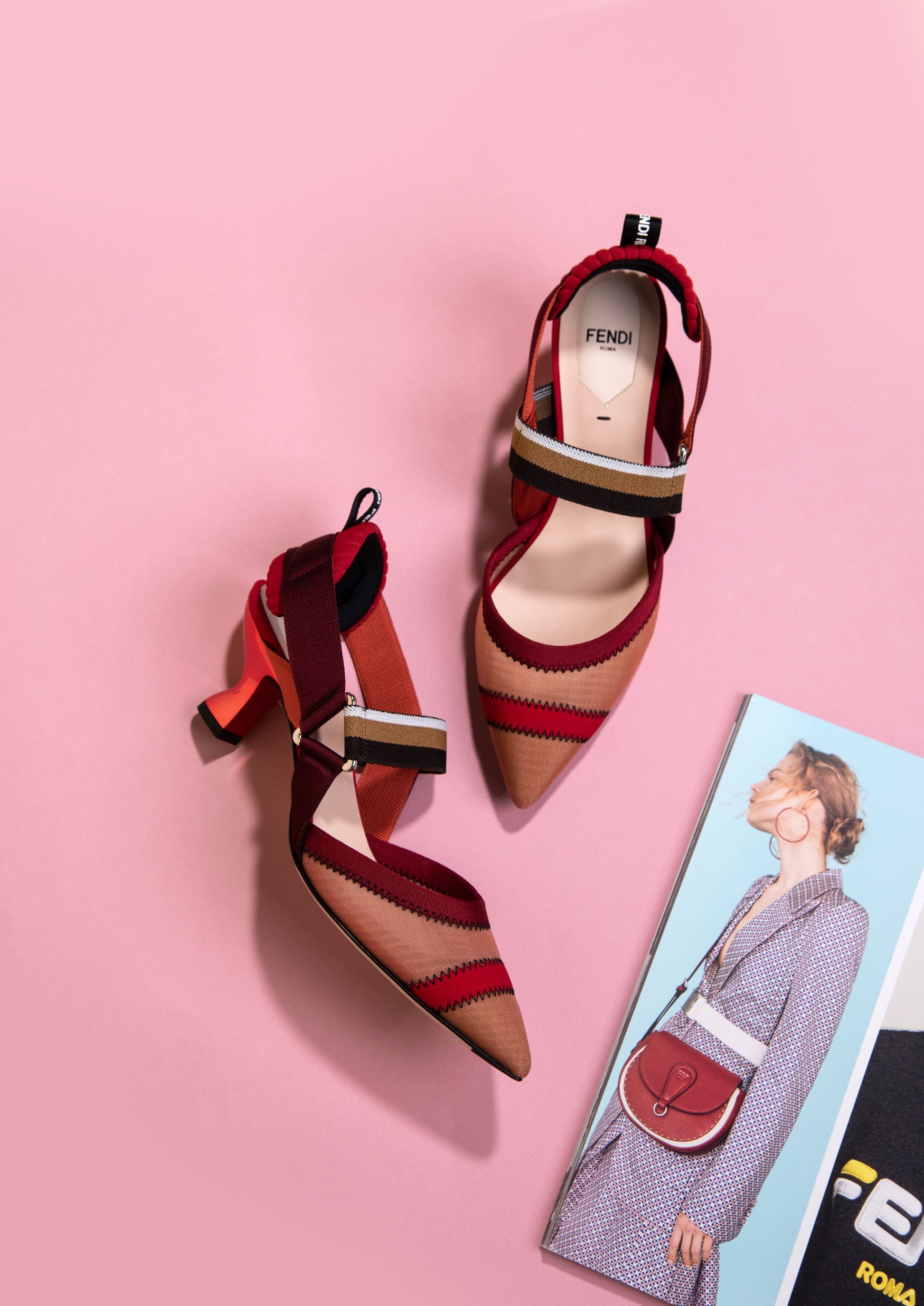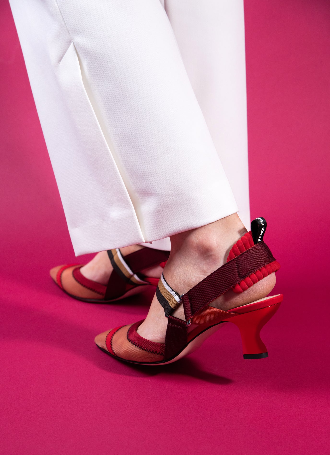 حذاء بكعب عالٍ من القماش الشبكي من فندي كوليبري وحقيبة لورو بيانا L19 برتقالية اللون