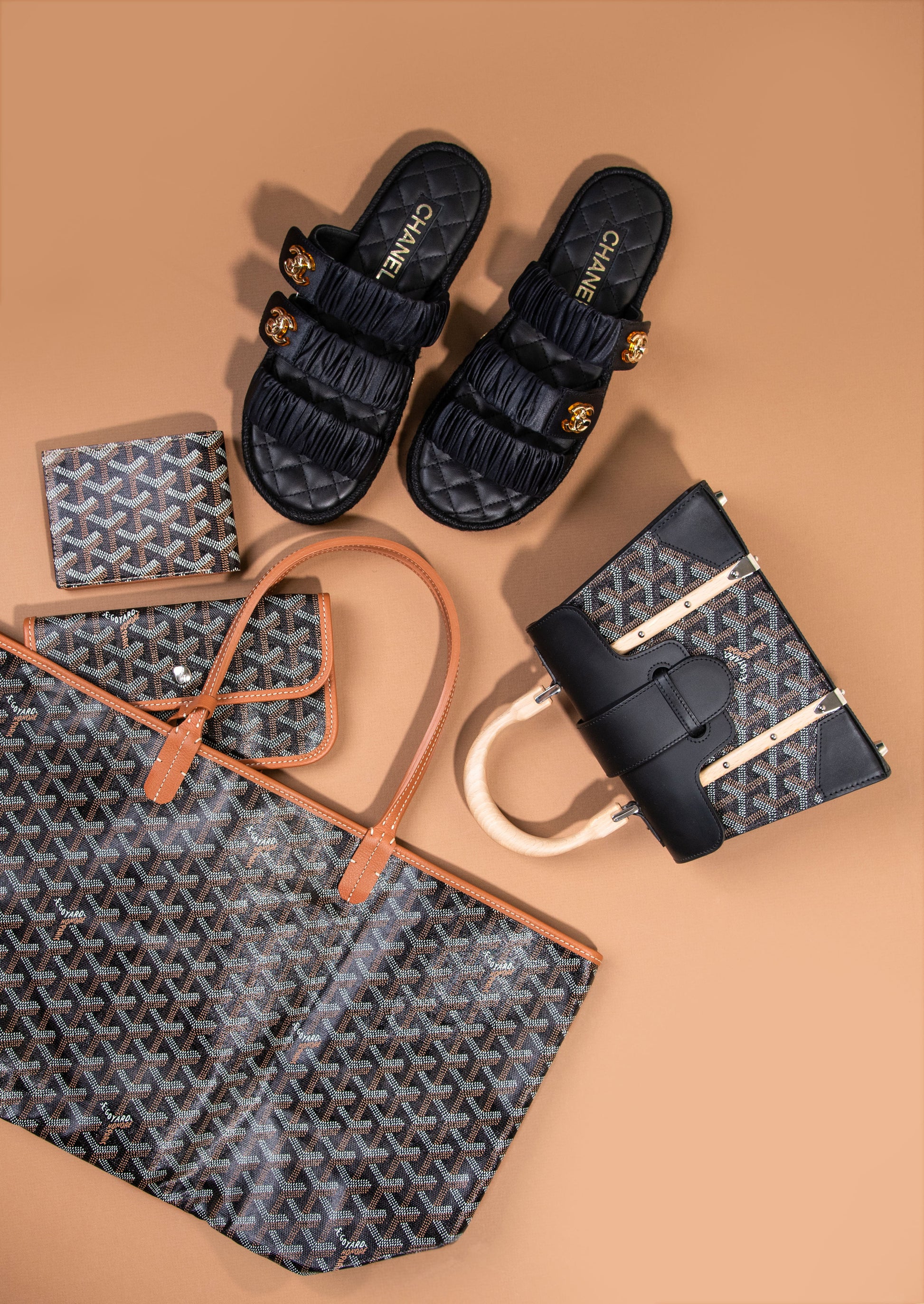 جويارد - محفظة فيكتوار وحقيبة سانت لويس PM مع حقيبة سايجون ستركتشر وصندل شانيل CC أسود بقفل دوار