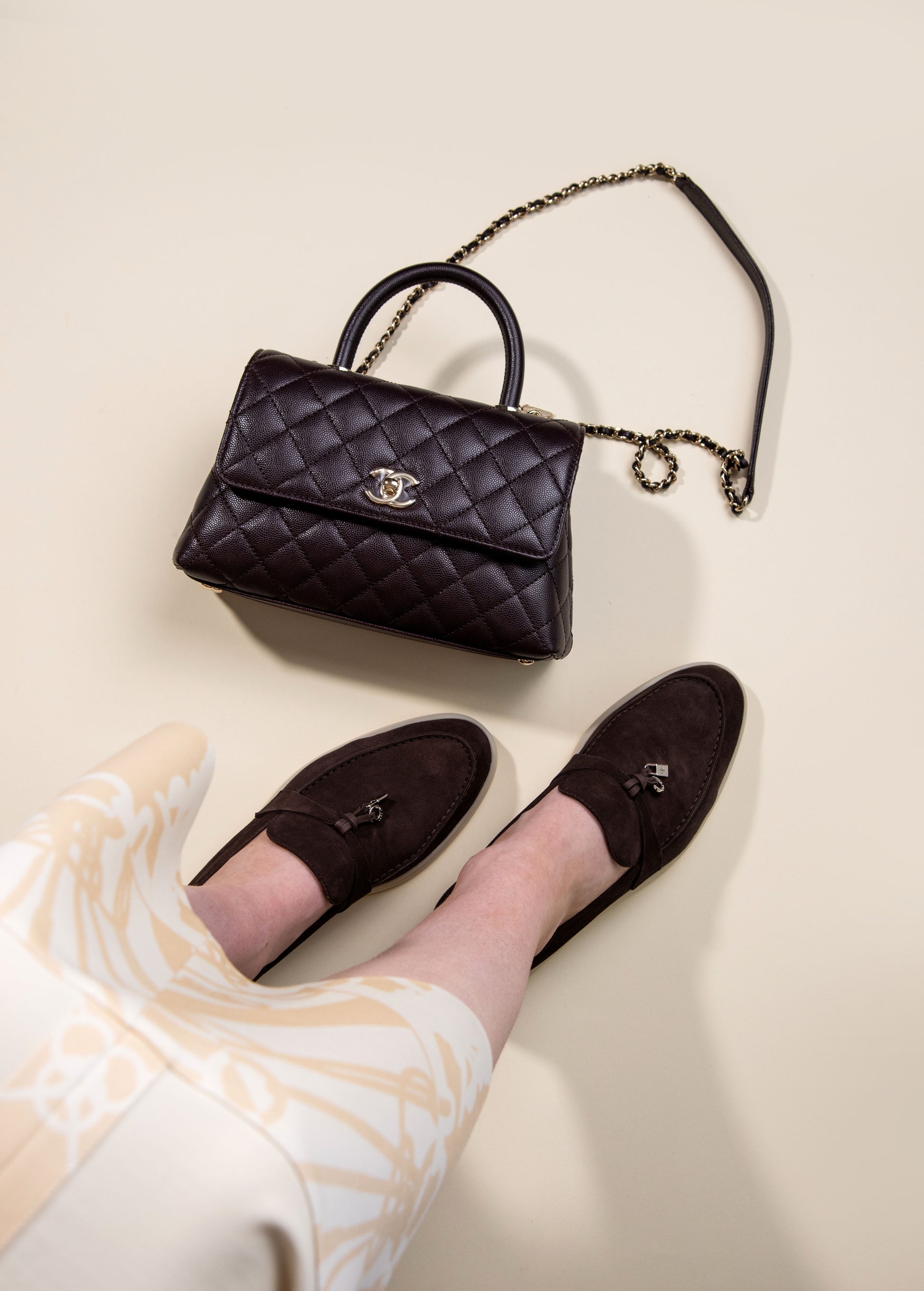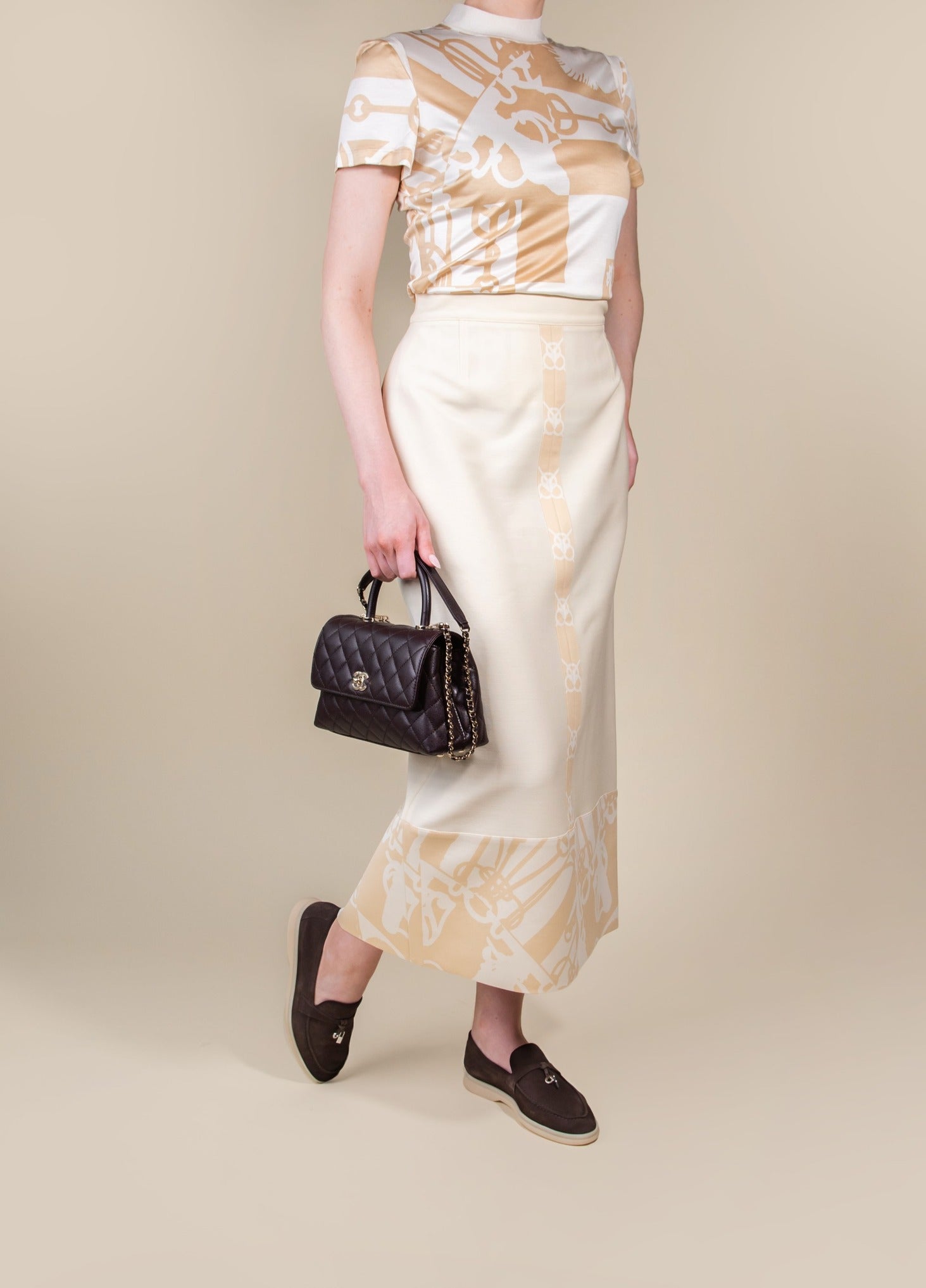 هيرمس - بلوزة وتنورة بلانك كاس مع حقيبة شانيل كوكو بنية اللون ومقبض لورو بيانا الصيفي باللون البني