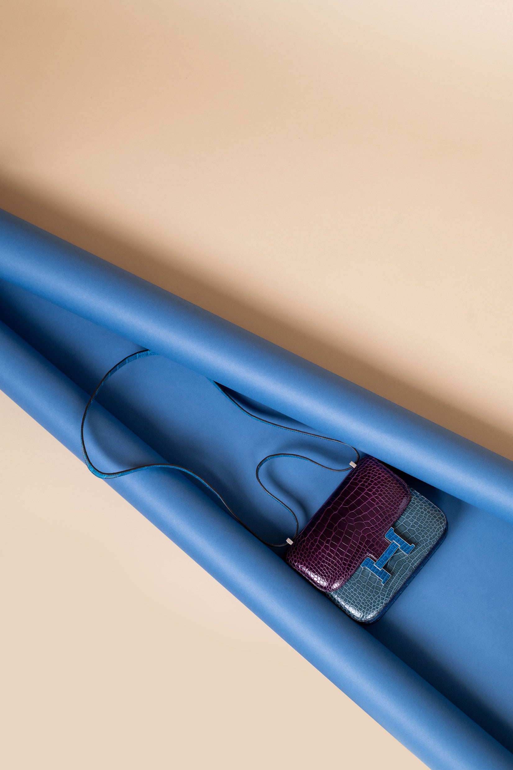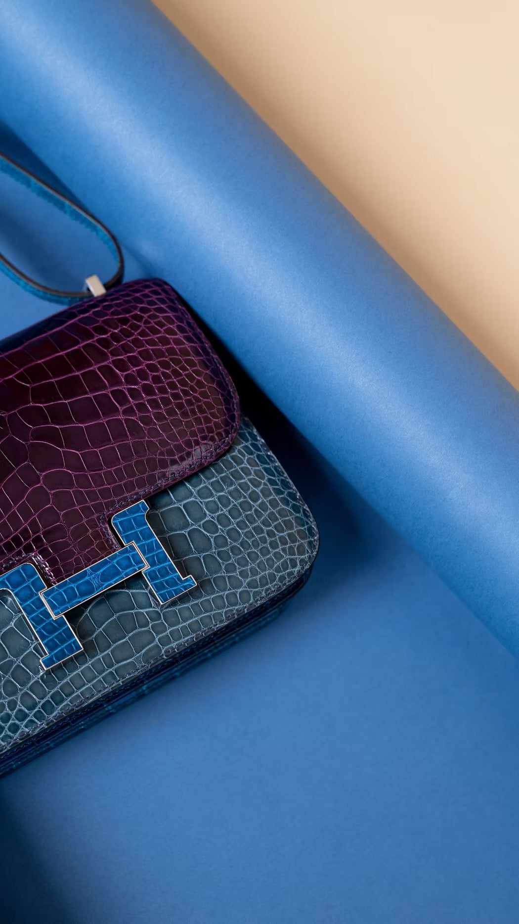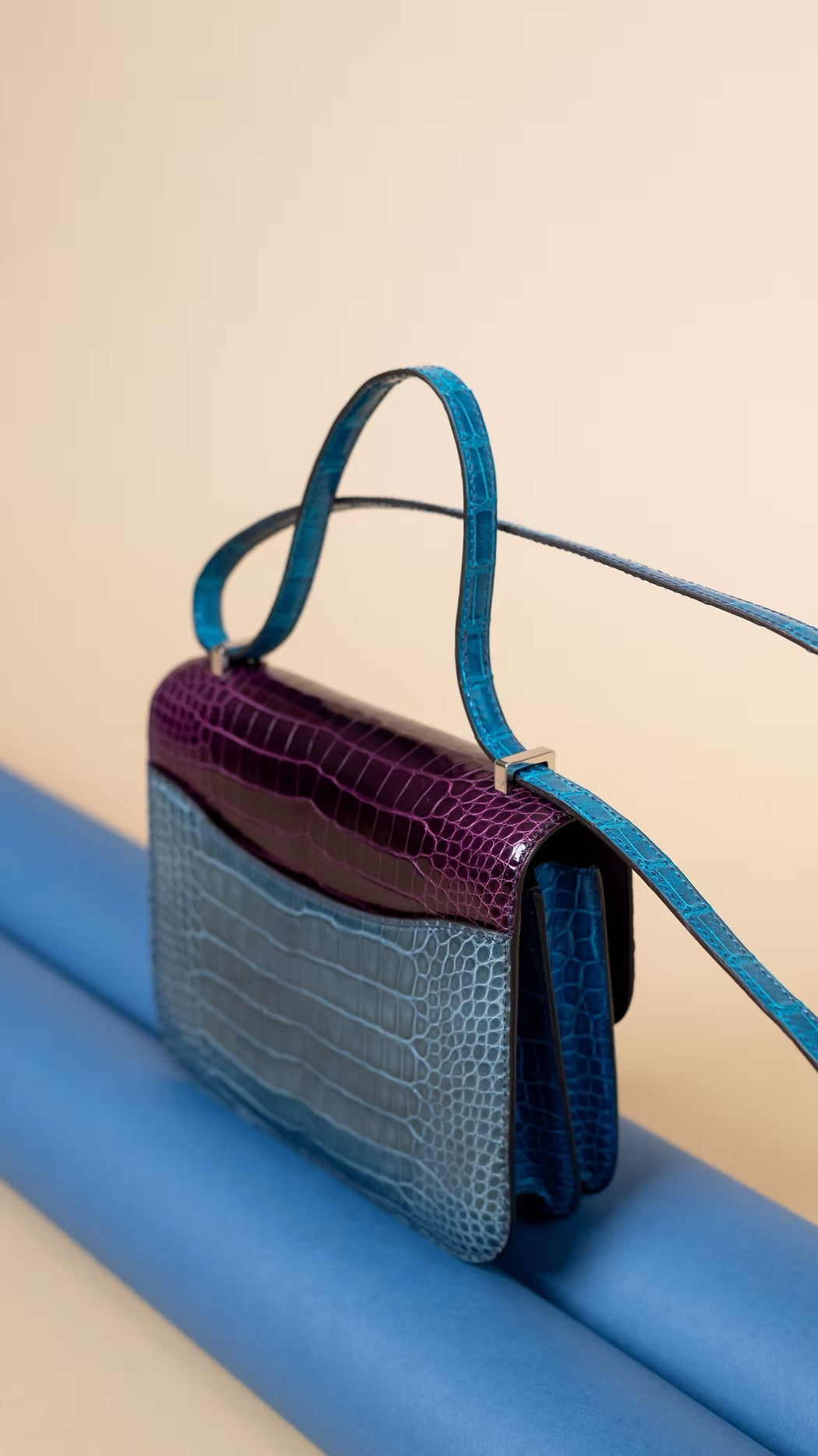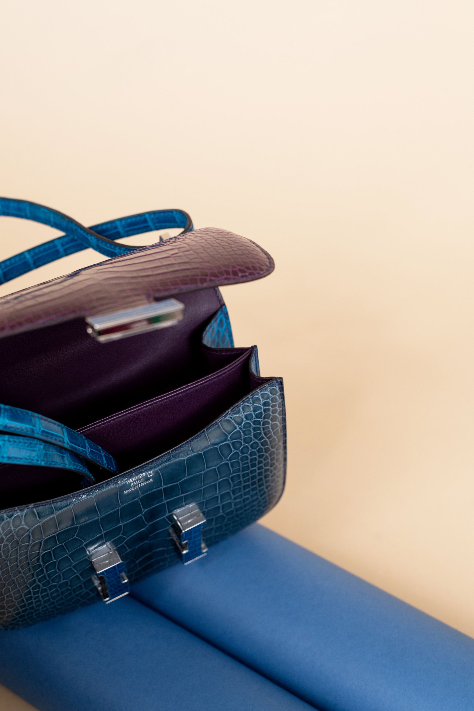 حقيبة هيرميس كونستانس 18 لامعة من جلد التمساح باللون الكاسي/الأزرق تيمبيت/الأزرق إزمير