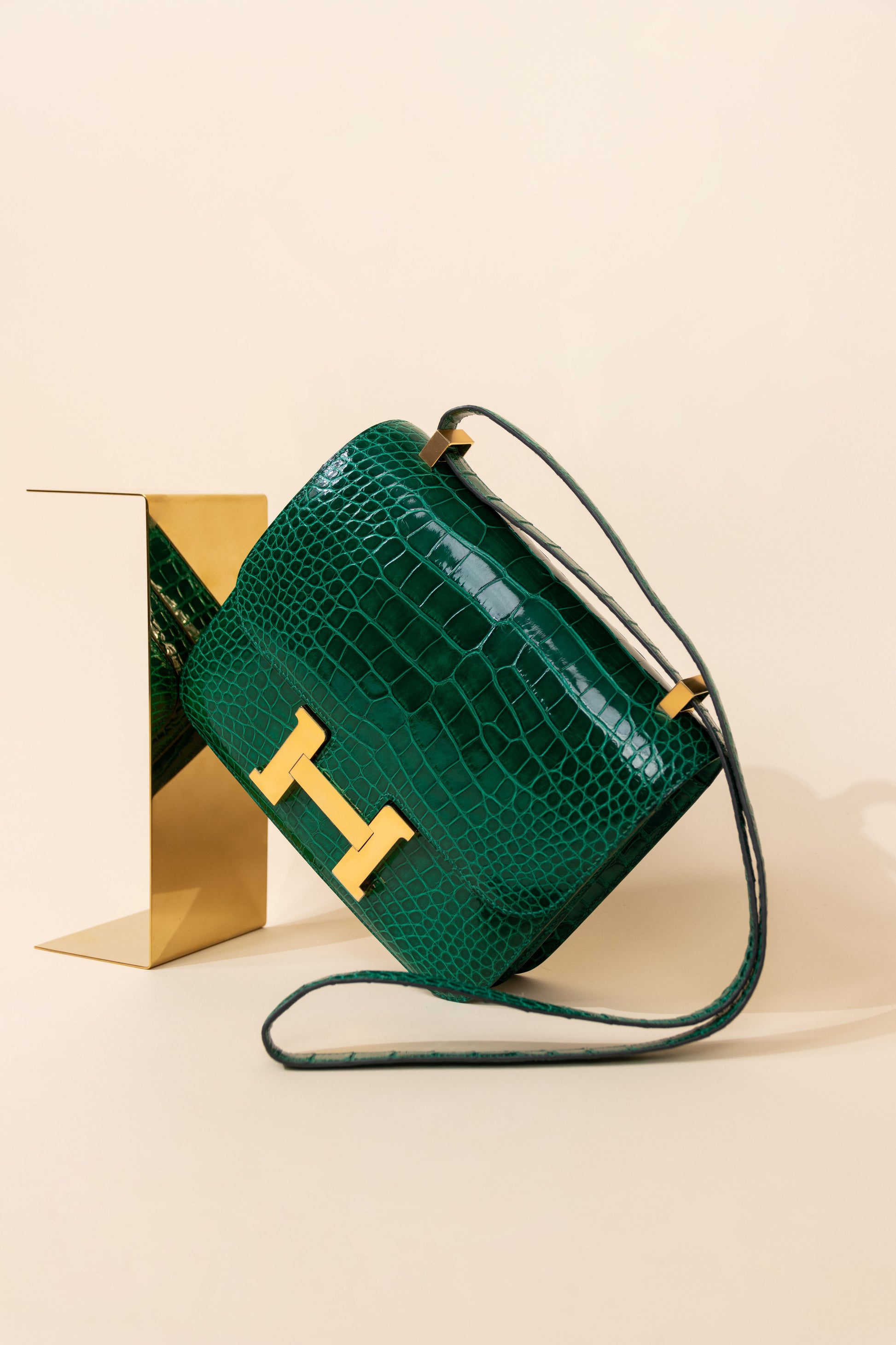 حقيبة هيرميس كونستانس 24 لامعة من جلد التمساح باللون الأخضر الزمردي
