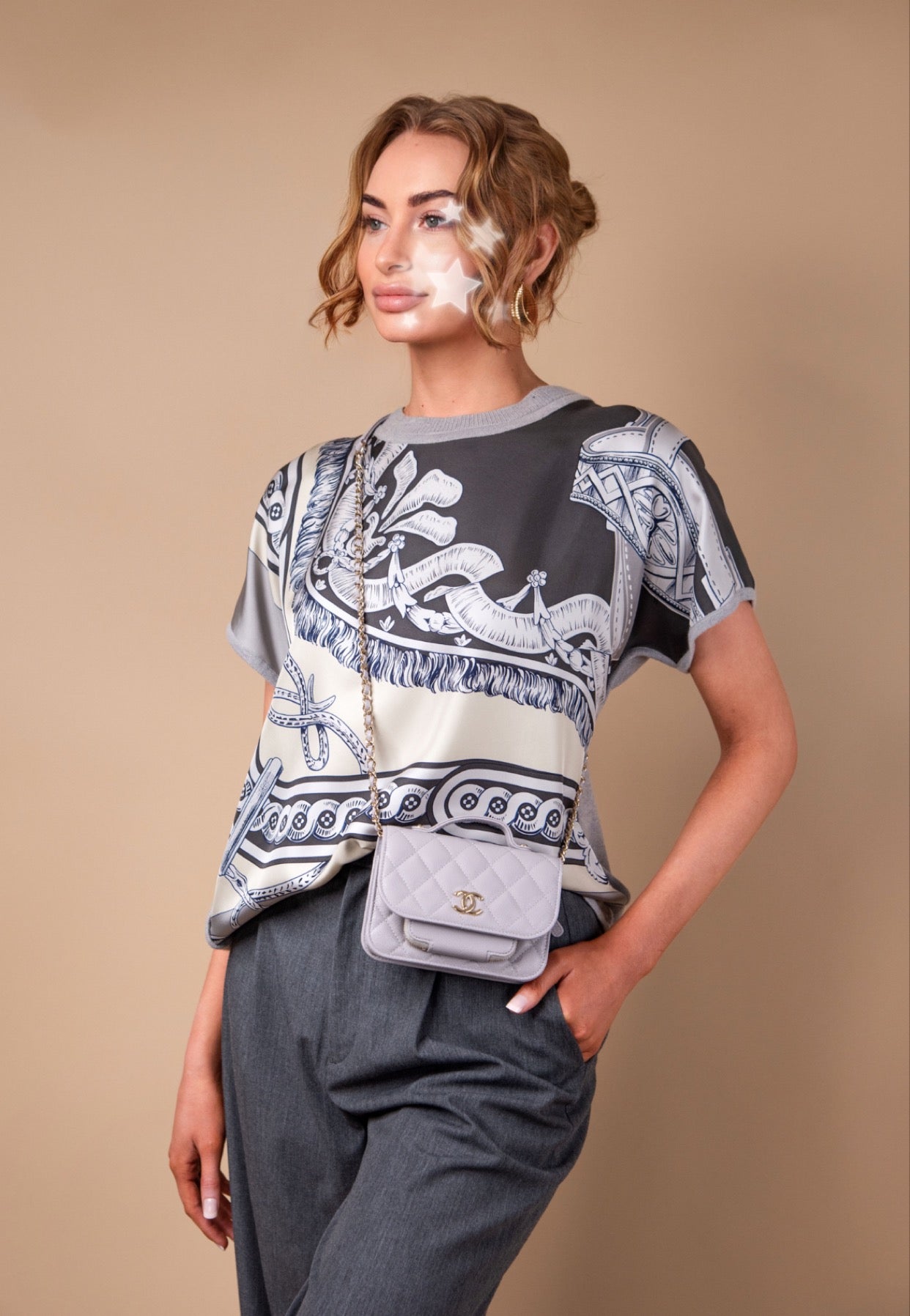 بلوزة هيرمس رمادية اللون وحقيبة كلاتش شانيل بسلسلة باللون الخزامي الفاتح