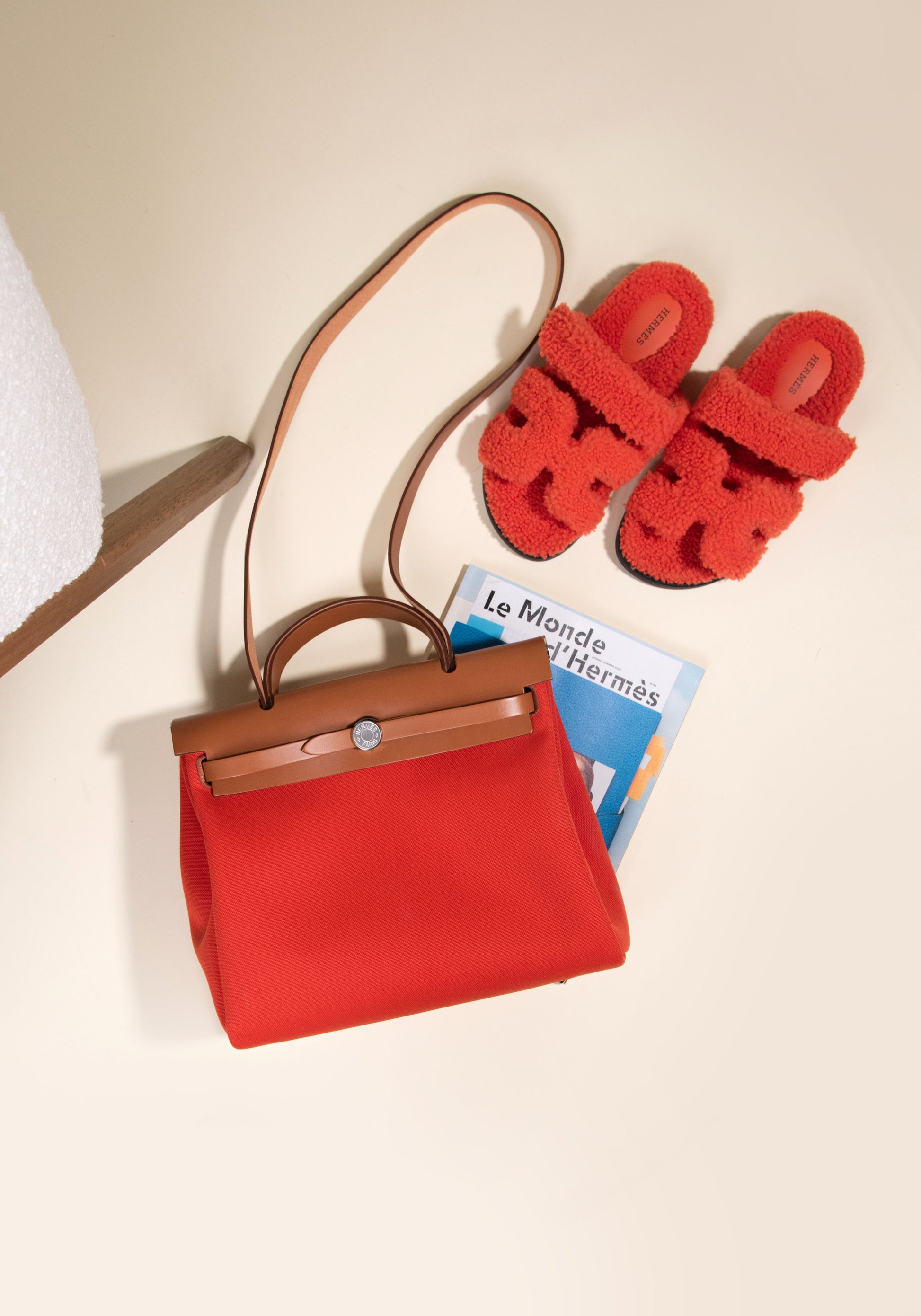 هيرميس - حقيبة هيرباغ 31 باللون البرتقالي ميكانو/فوف مع صندل من جلد الغنم شيبر