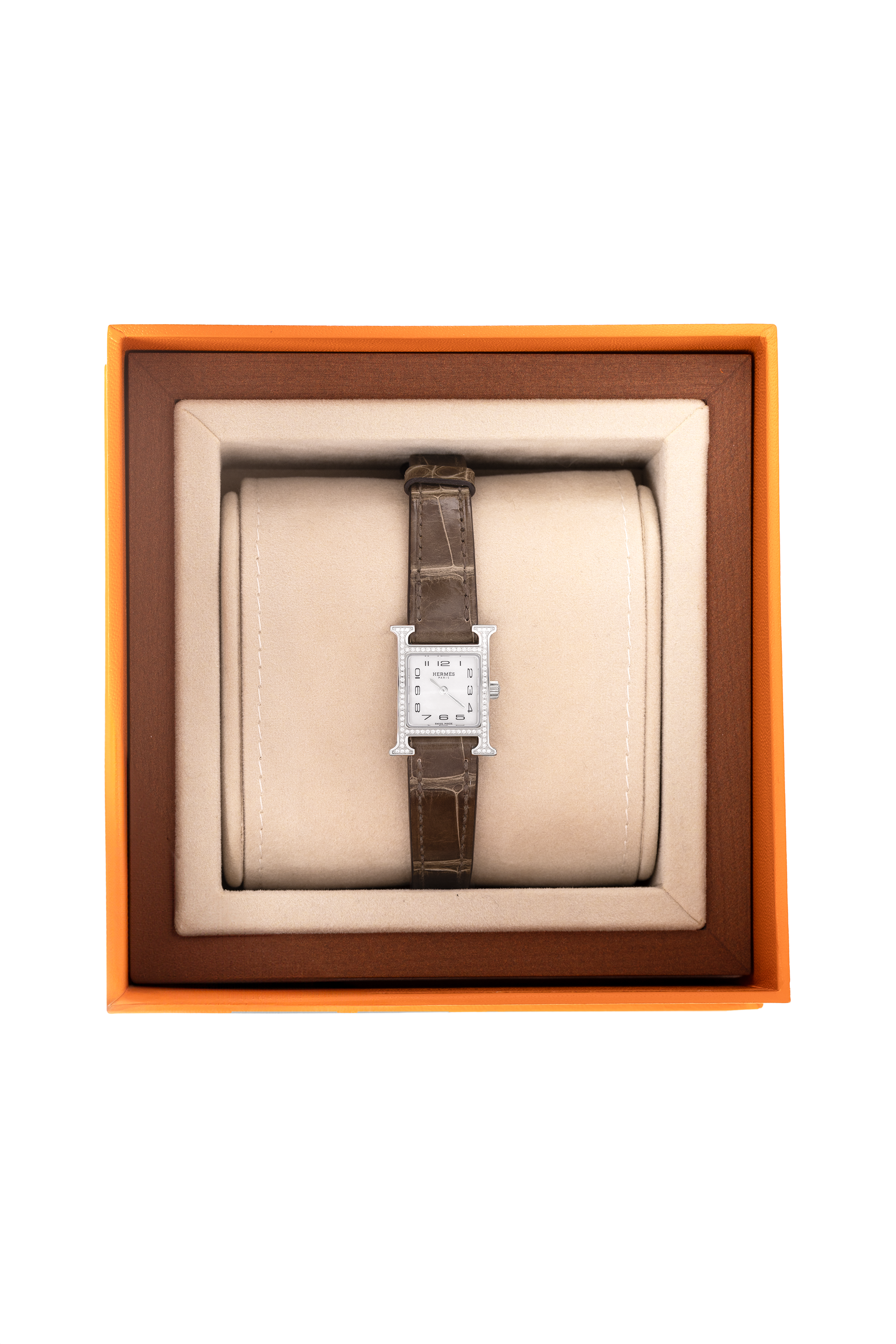 Hermès Heure Watch in Diamond-Set Stainless Steel with Gris Éléphant Alligator Strap