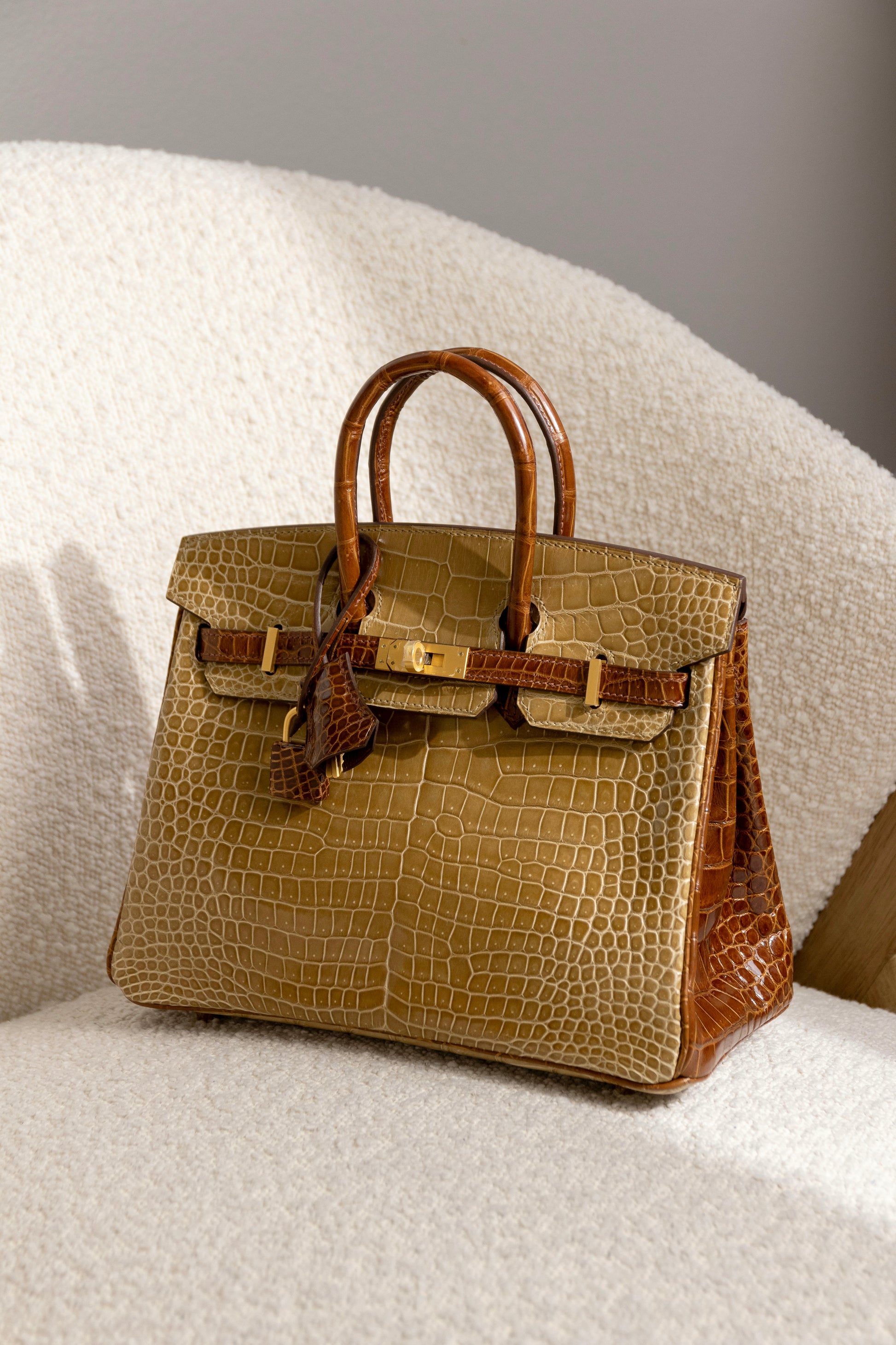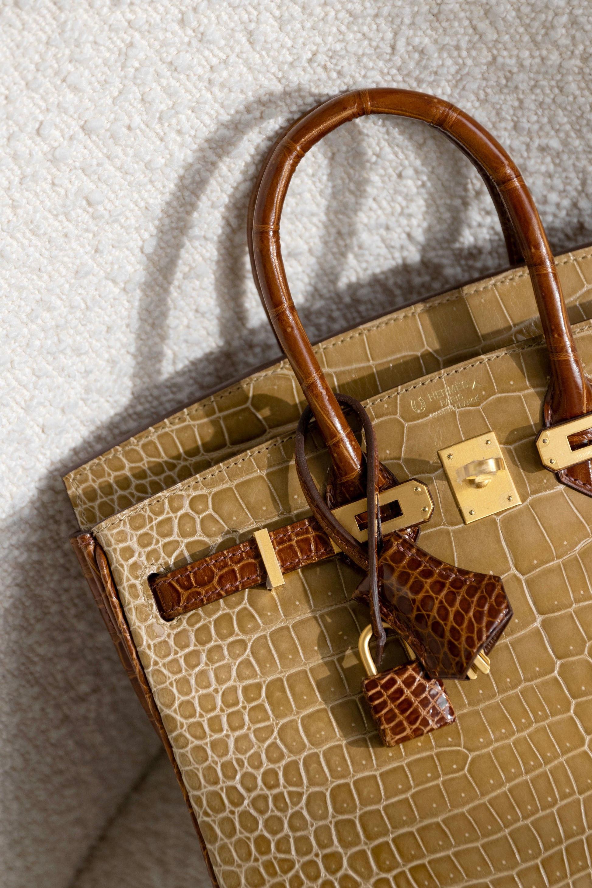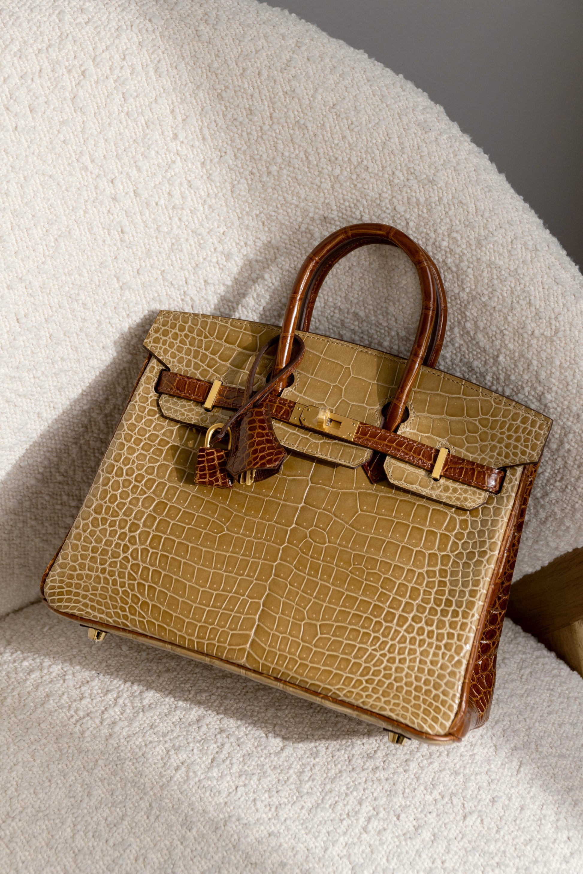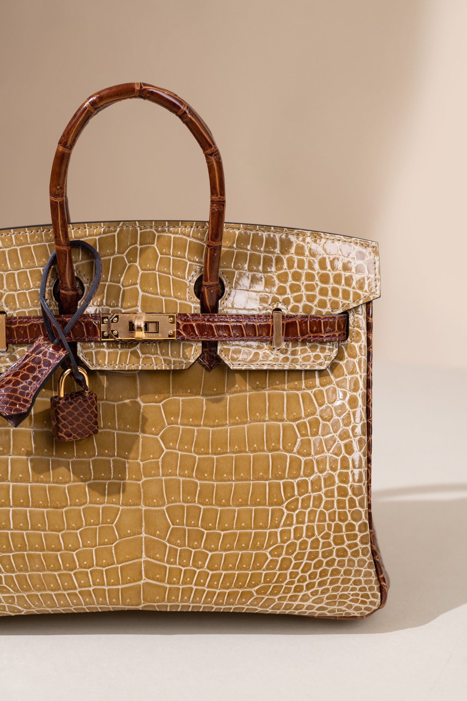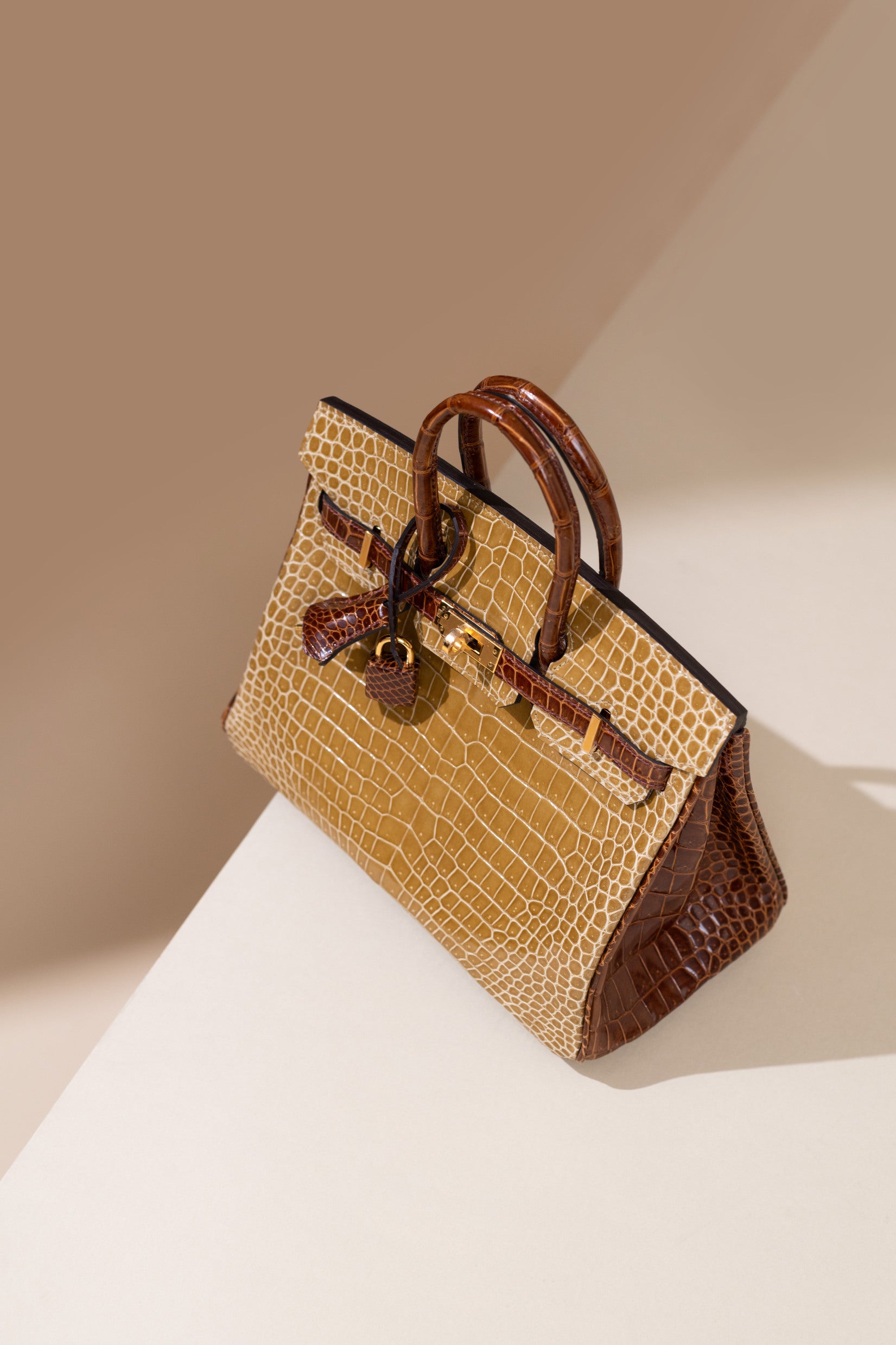 حقيبة هيرميس HSS بيركين 25 لامعة من جلد التمساح باللون البيج السمور/العسل GHW
