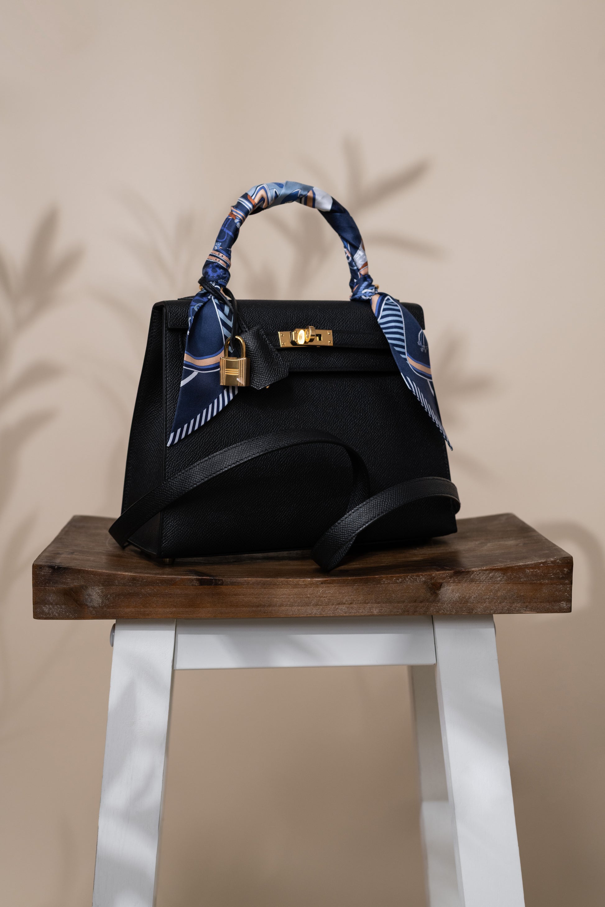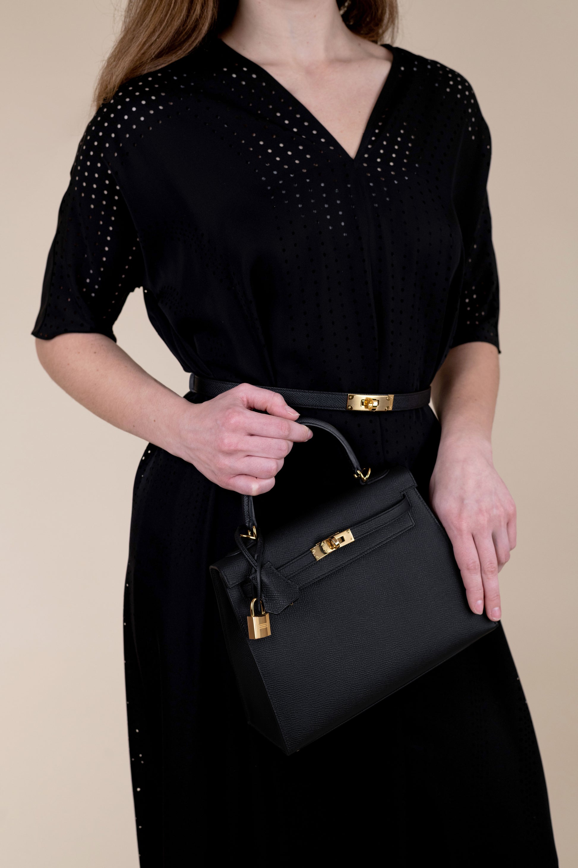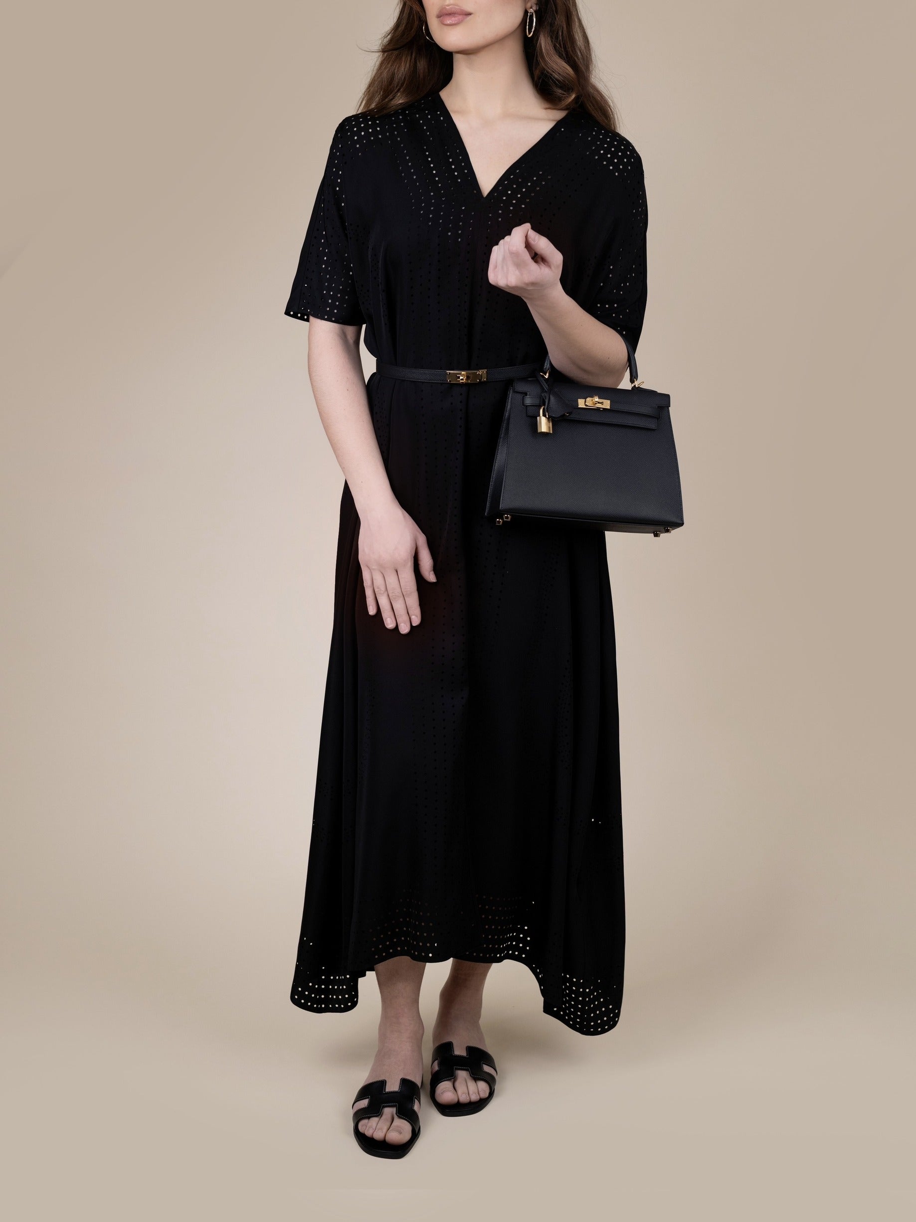 حذاء هيرميس كيلي 25 إبسوم أسود GHW وقفطان أسود مثقوب مع حزام كيلي أسود GHW