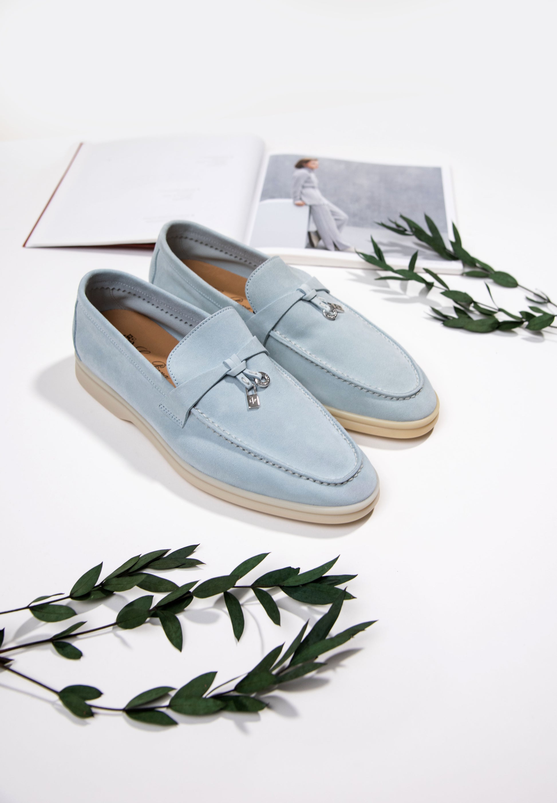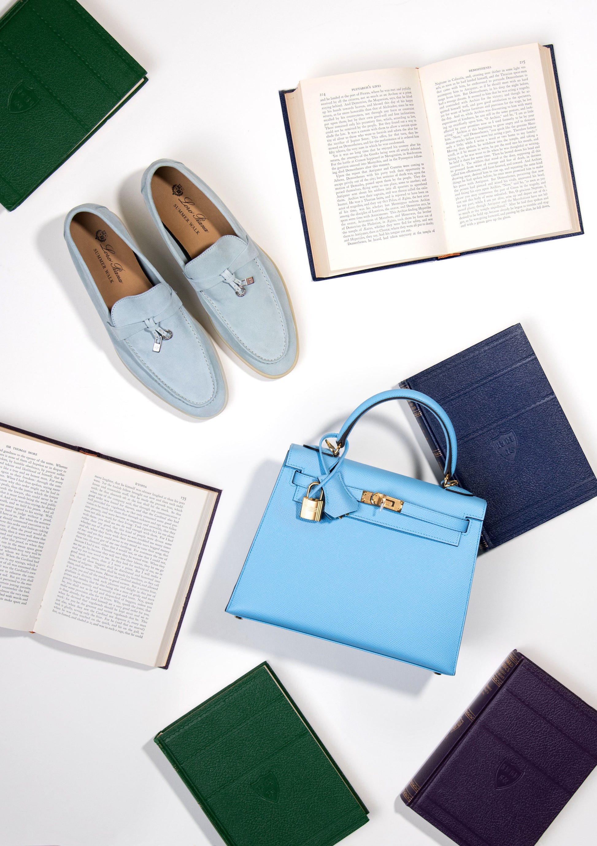 هيرميس - حذاء كيلي 25 إبسوم سيلير باللون الأزرق سيليست مع حذاء لورو بيانا سمر ووك لوفرز باللون السماوي