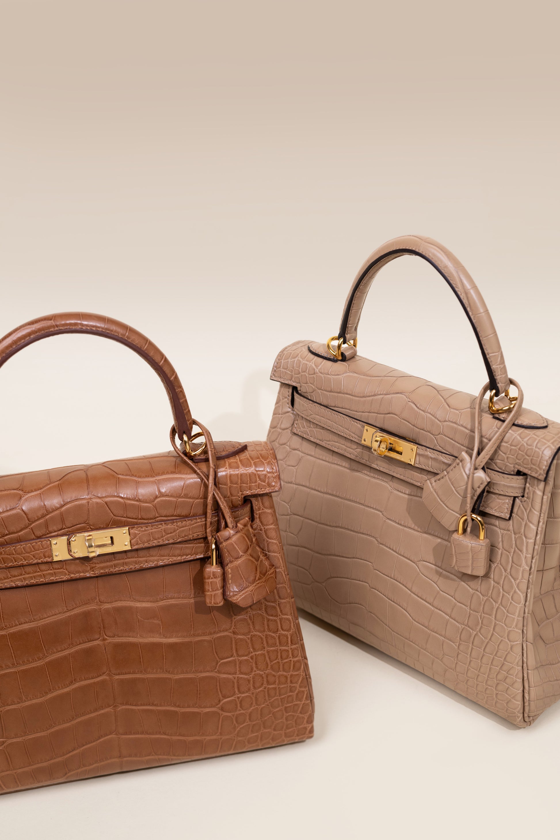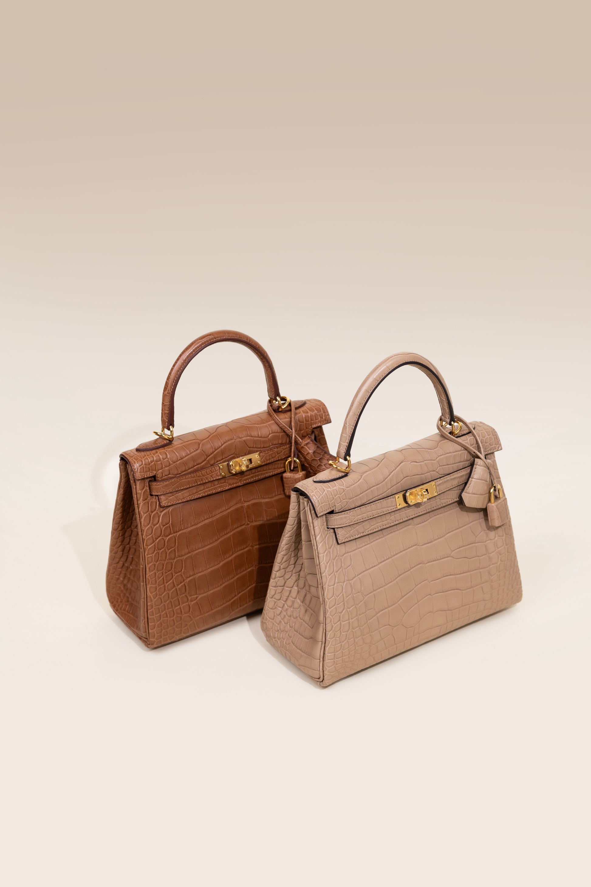 حقيبة هيرمس كيلي 25 ذهبية من جلد التمساح غير اللامع GHW وحقيبة كيلي 25 من جلد التمساح غير اللامع في تشاي GHW