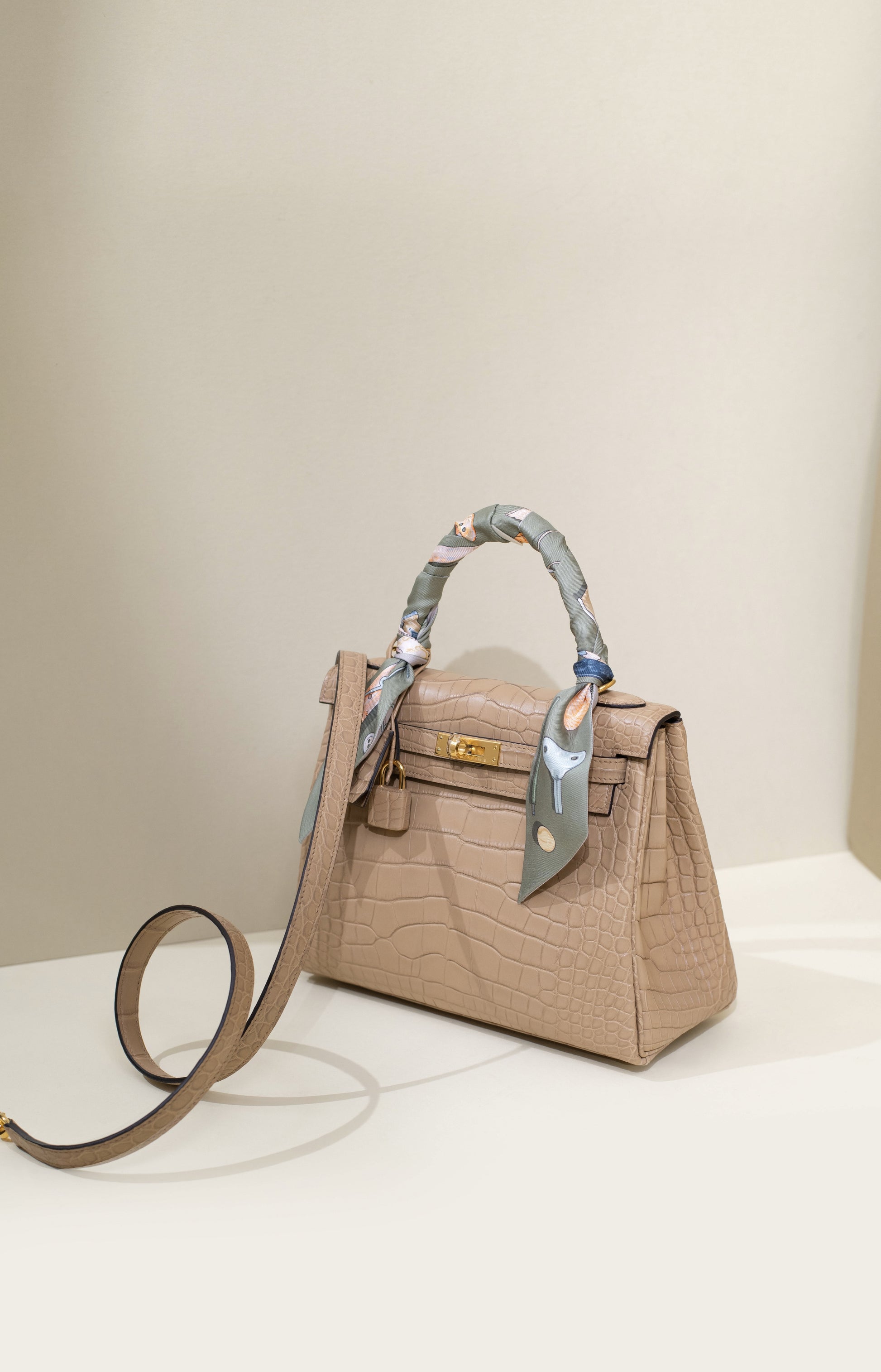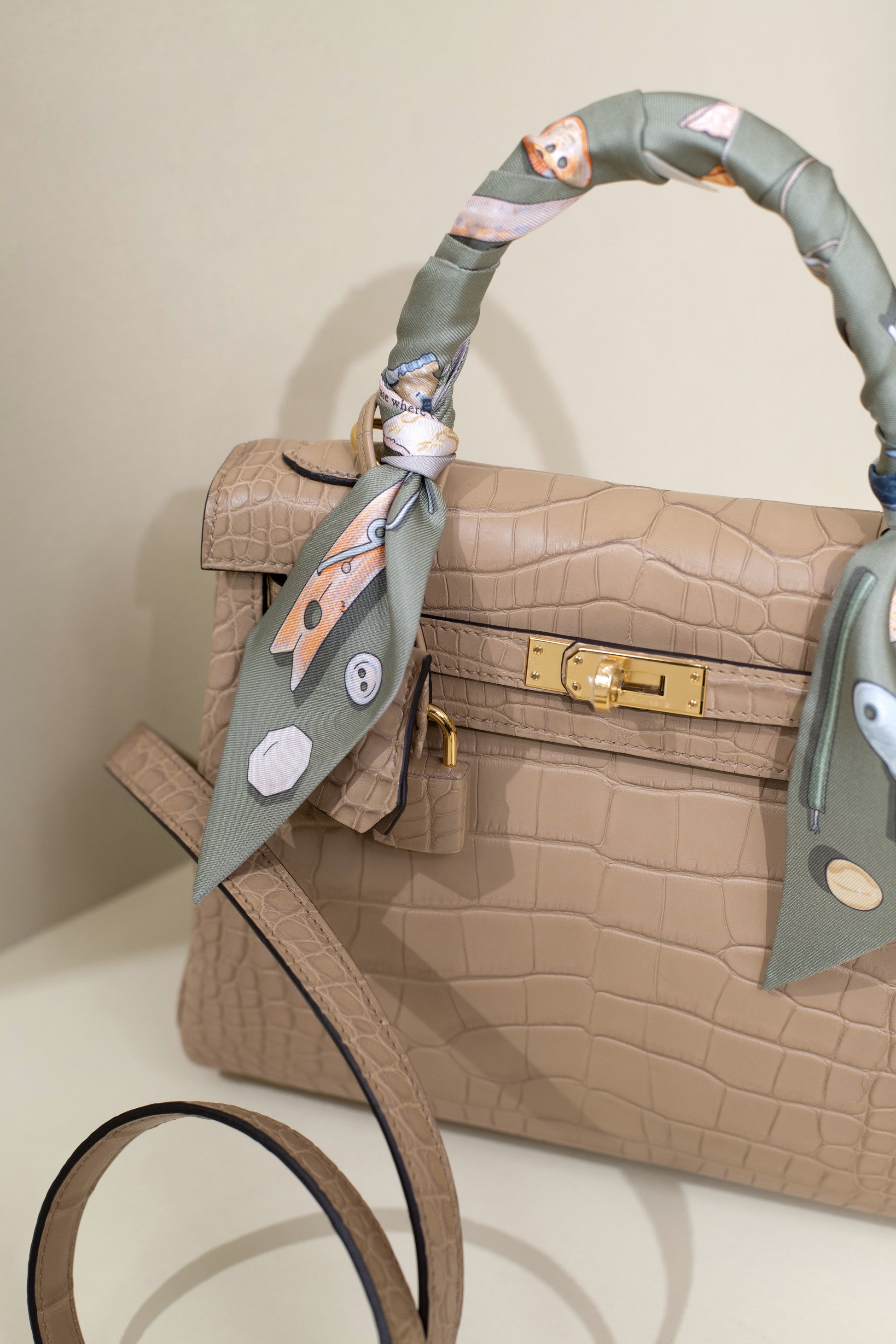 حقيبة هيرميس كيلي 25 من جلد التمساح غير اللامع باللون تشاي جي إتش دبليو مع تويلي