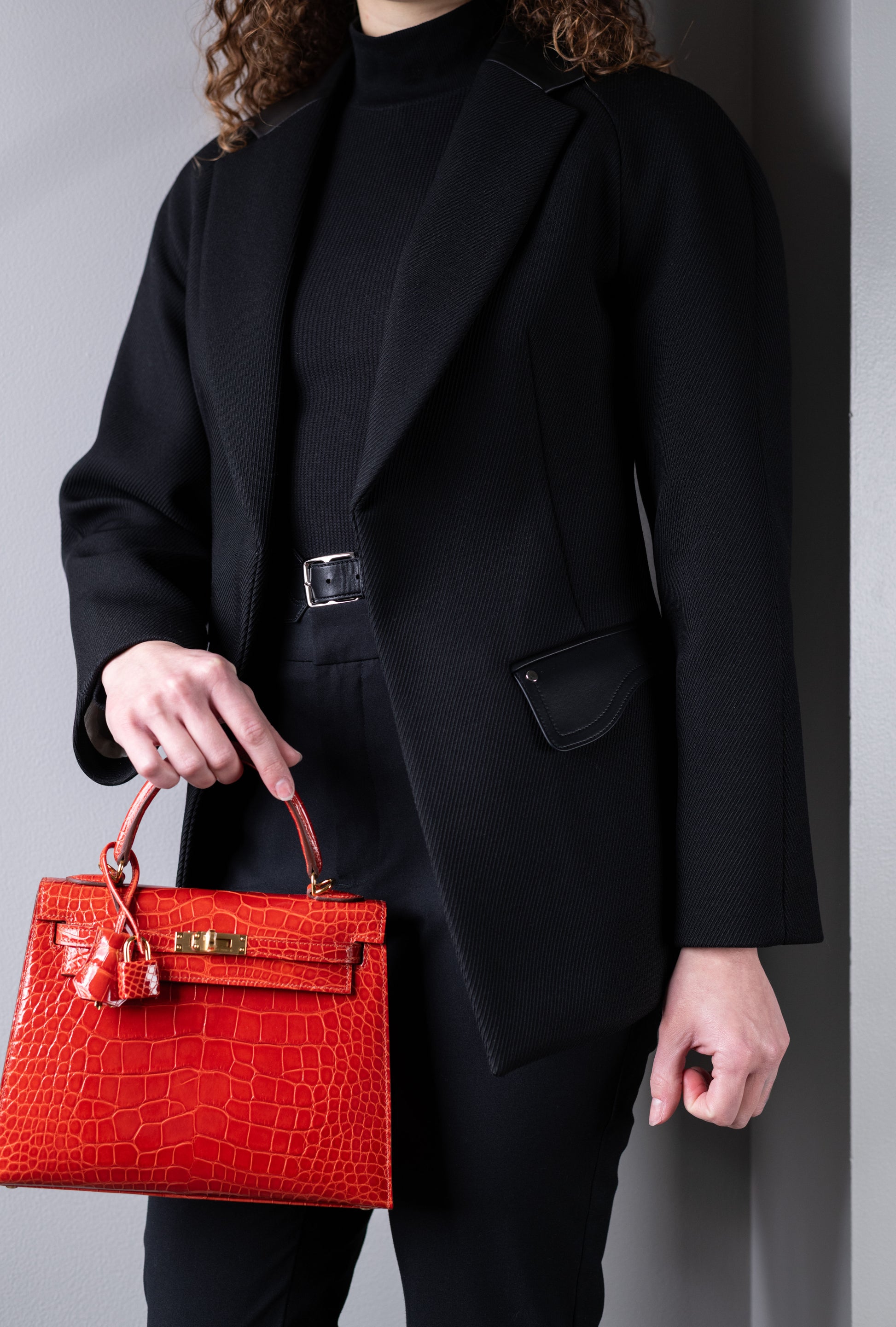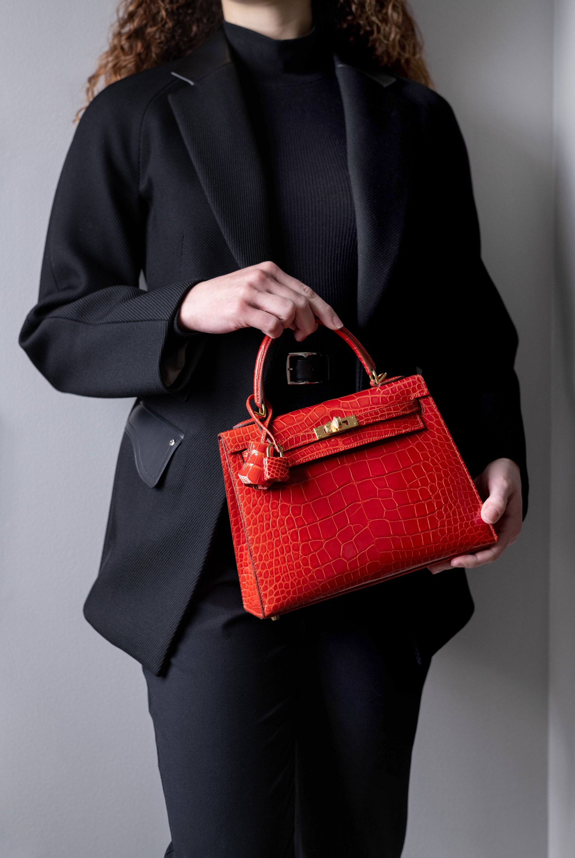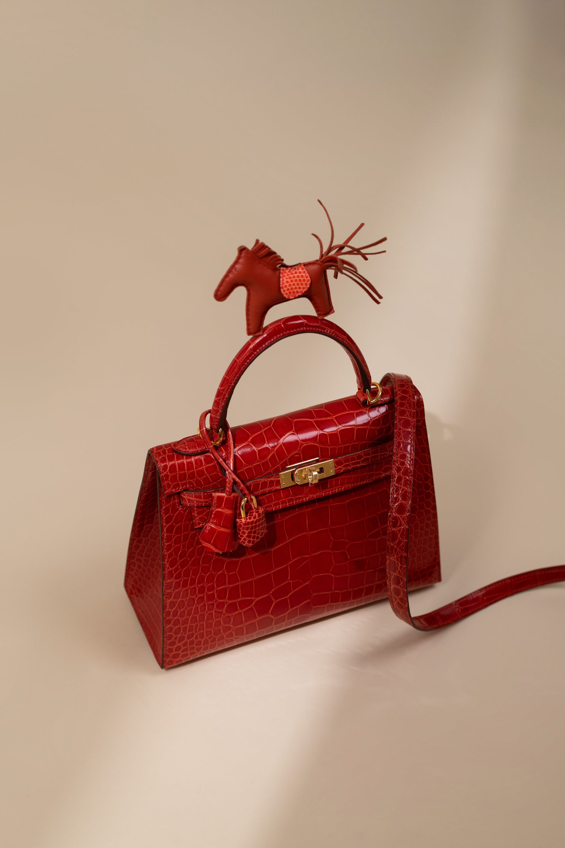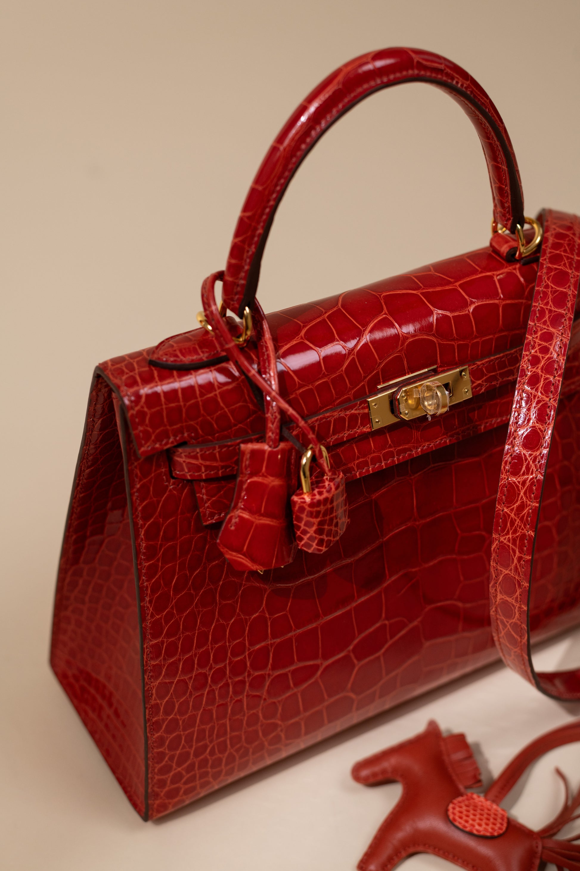حقيبة هيرميس كيلي 25 من جلد التمساح اللامع بلون سانجوين GHW