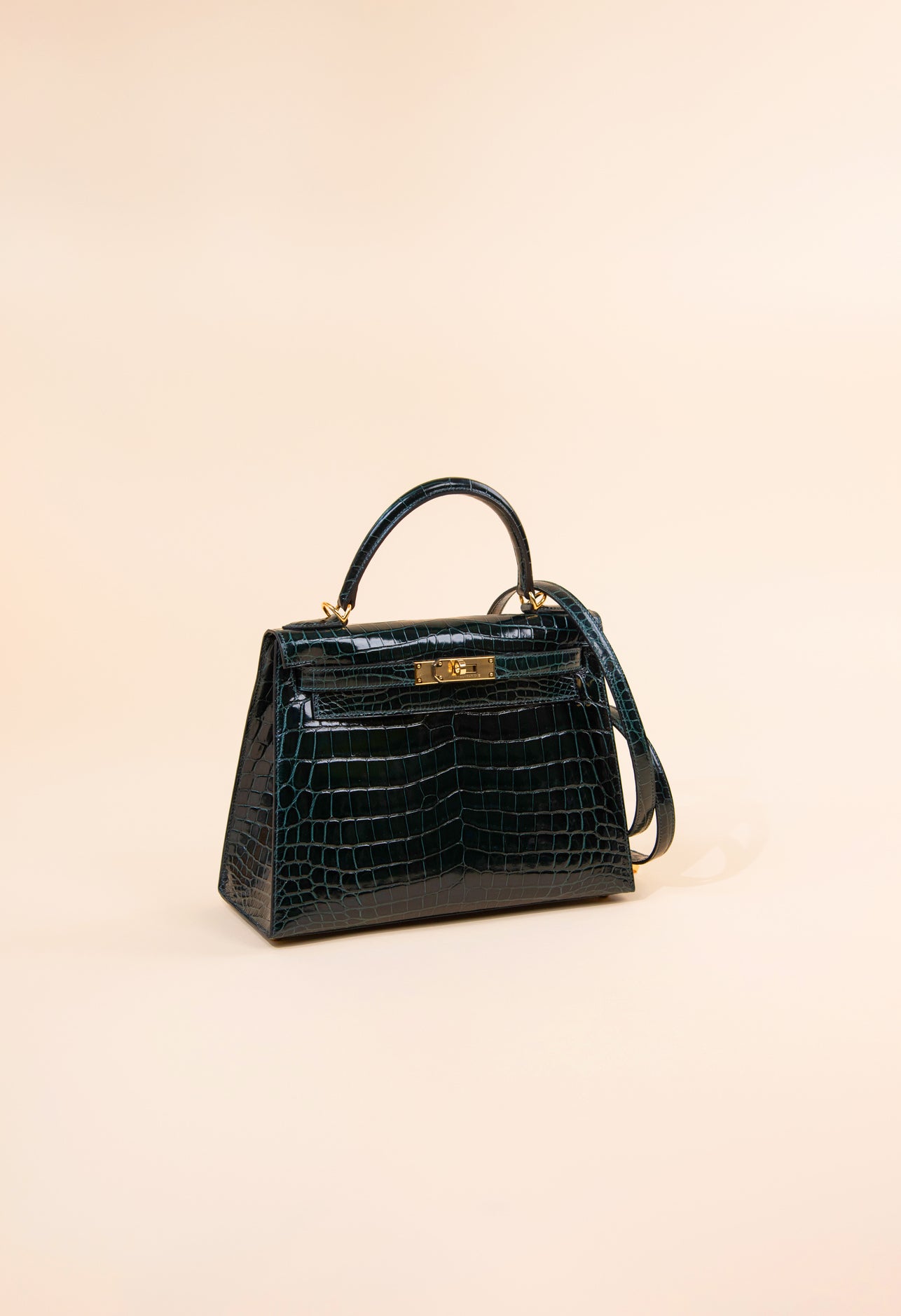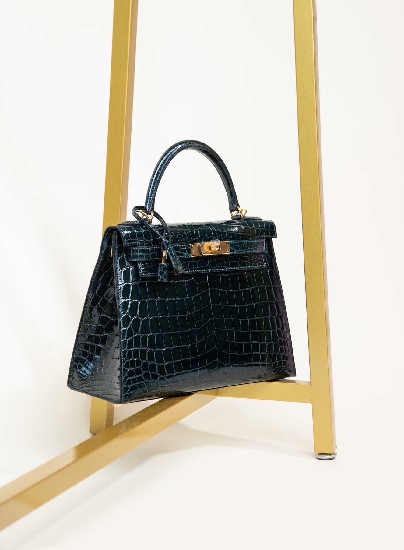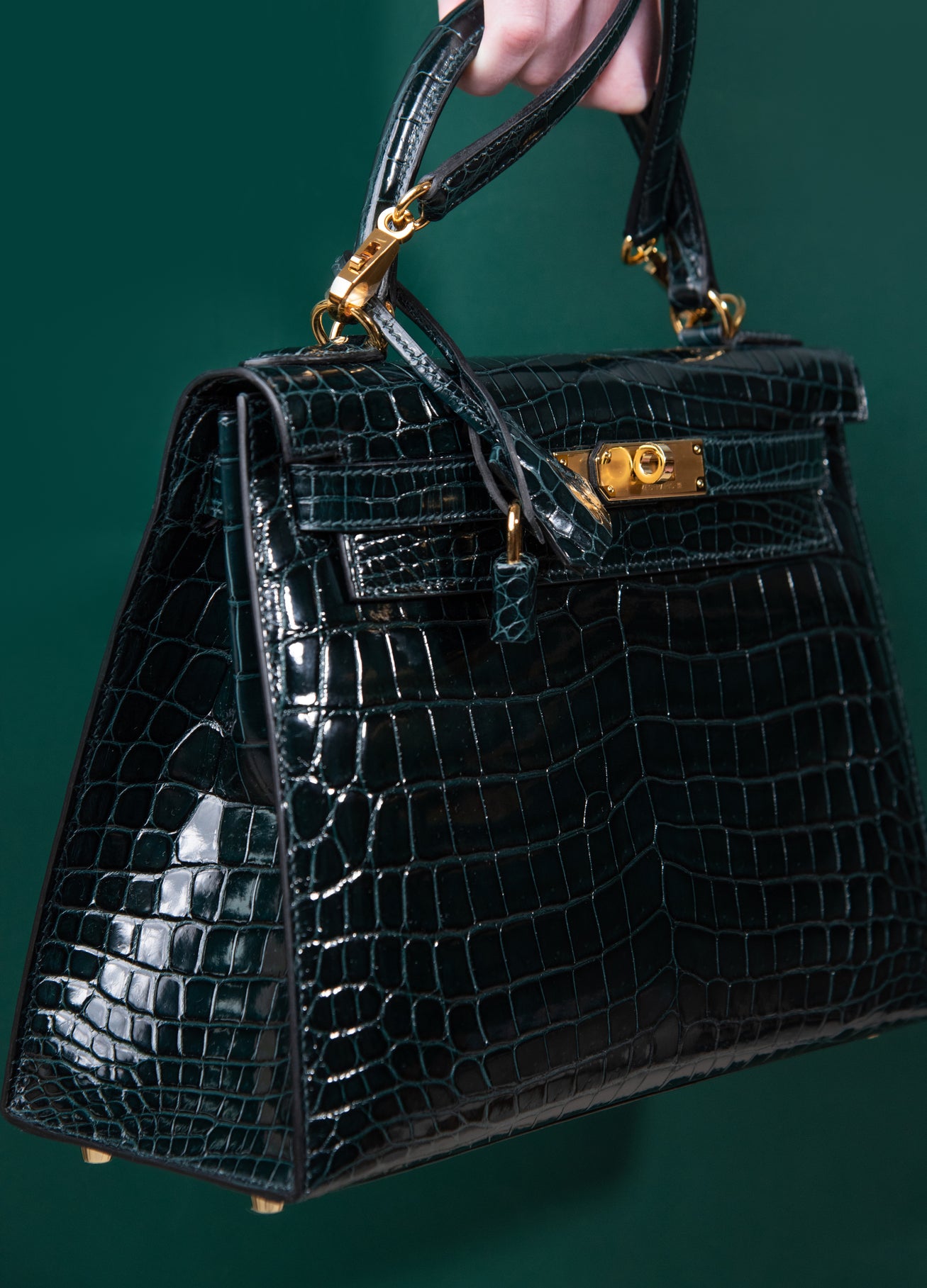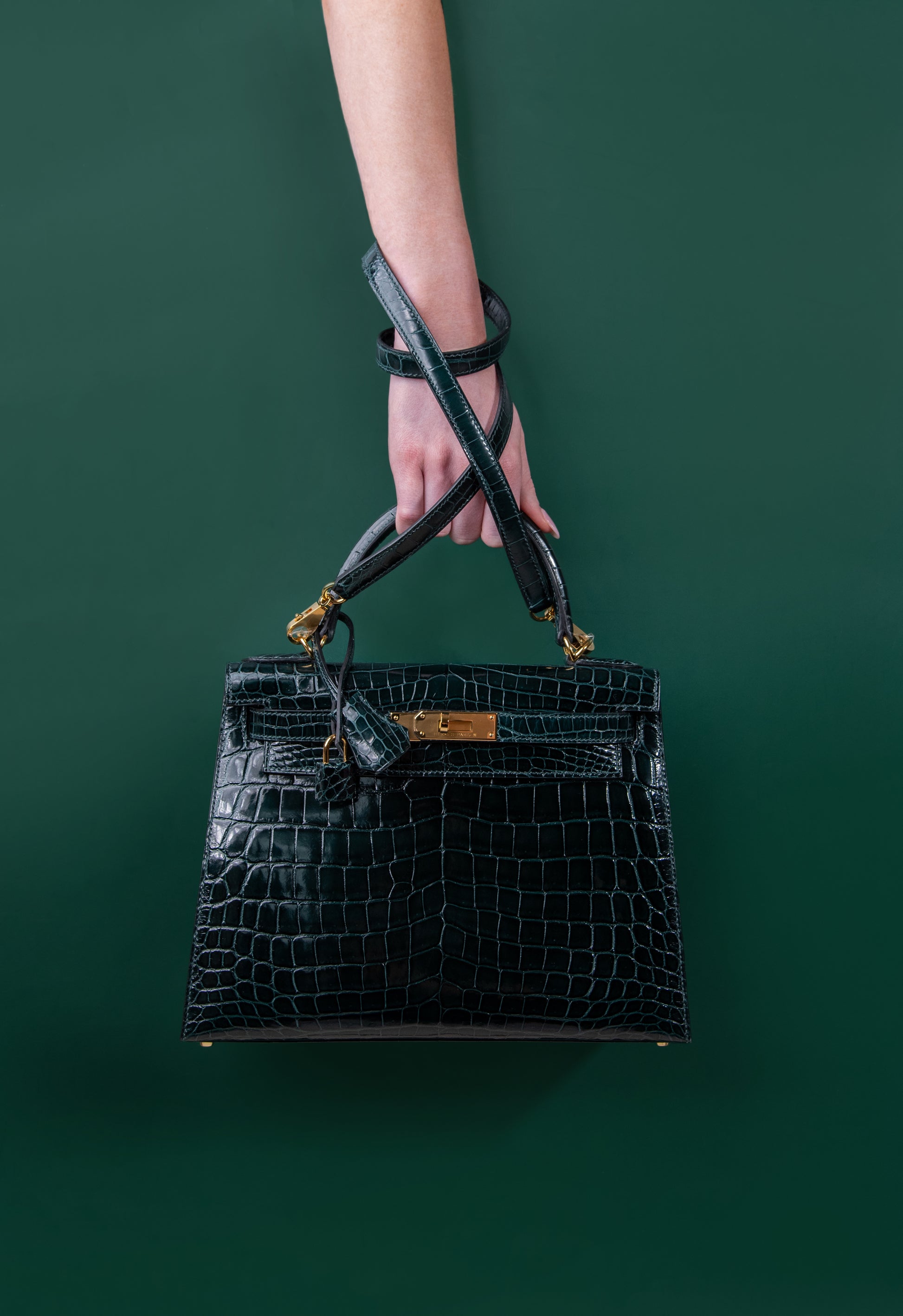 هيرميس - حقيبة كيلي 28 فيرت روسو لامعة من جلد التمساح باللون الأخضر GHW
