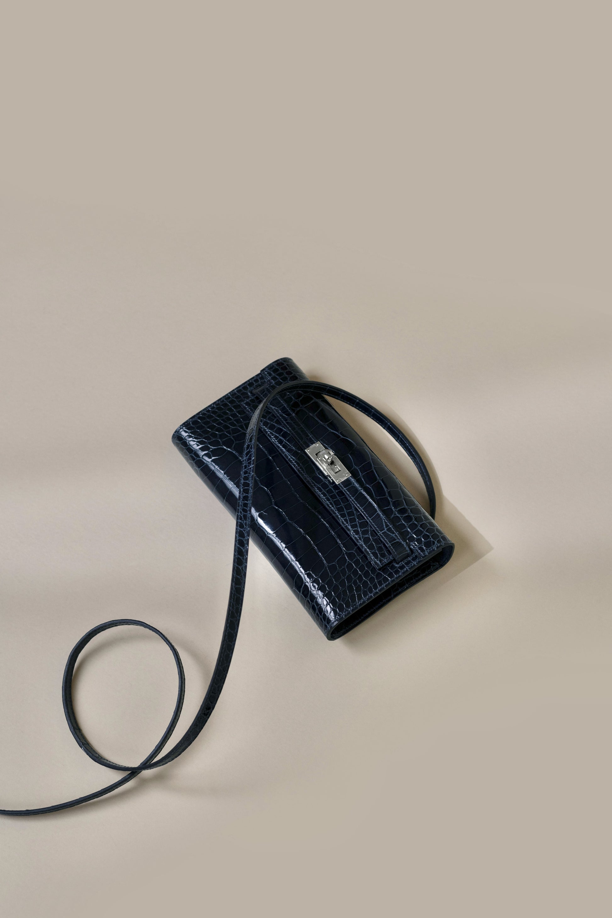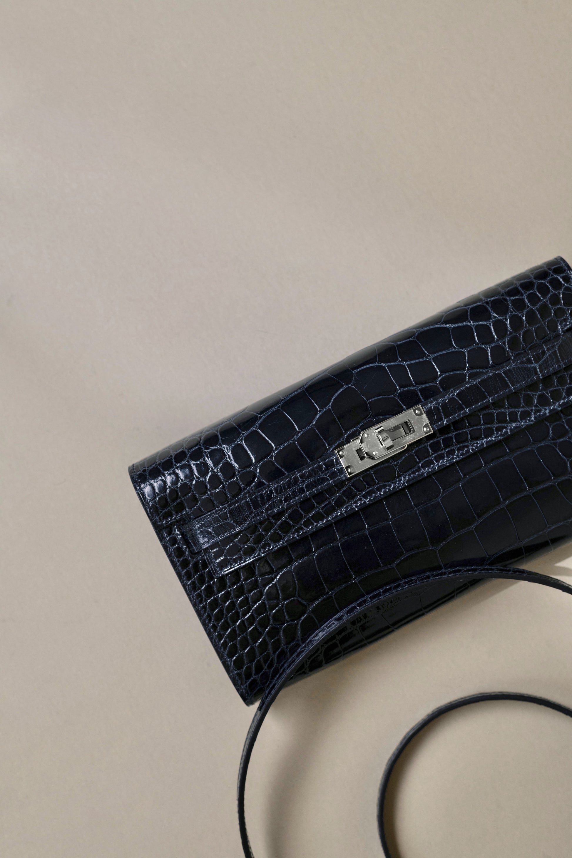 محفظة هيرميس كيلي تو جو بلون أزرق بحري لامع من جلد التمساح PHW
