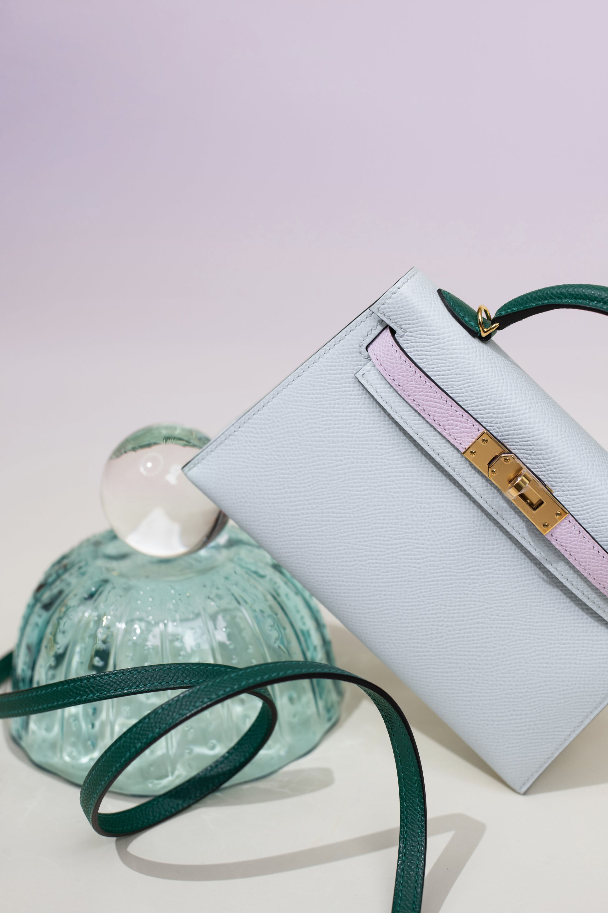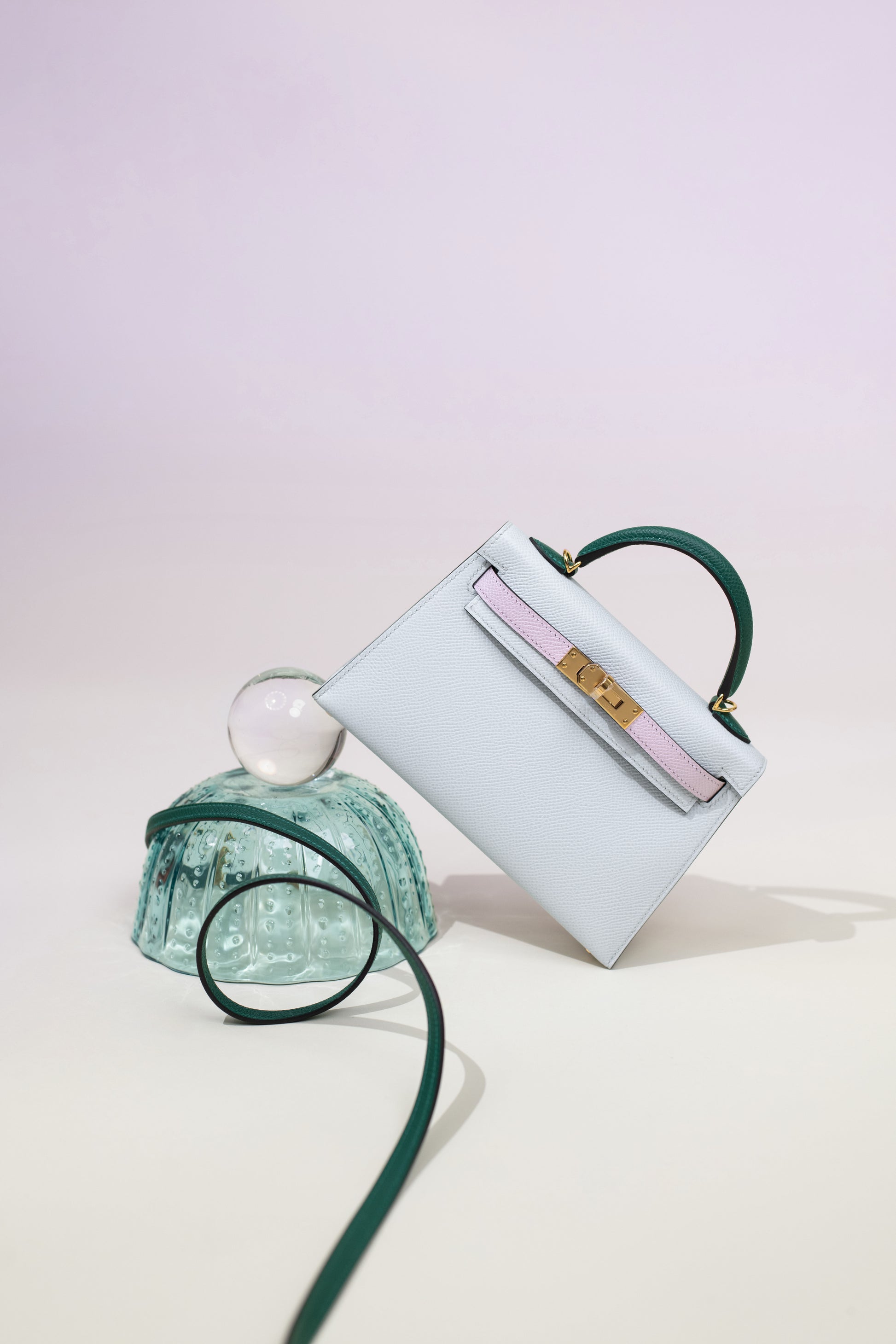 هيرميس ميني كيلي 20 إبسوم تريكولور في جريس بلاتين / موف شاحب / فيرت موين GHW
