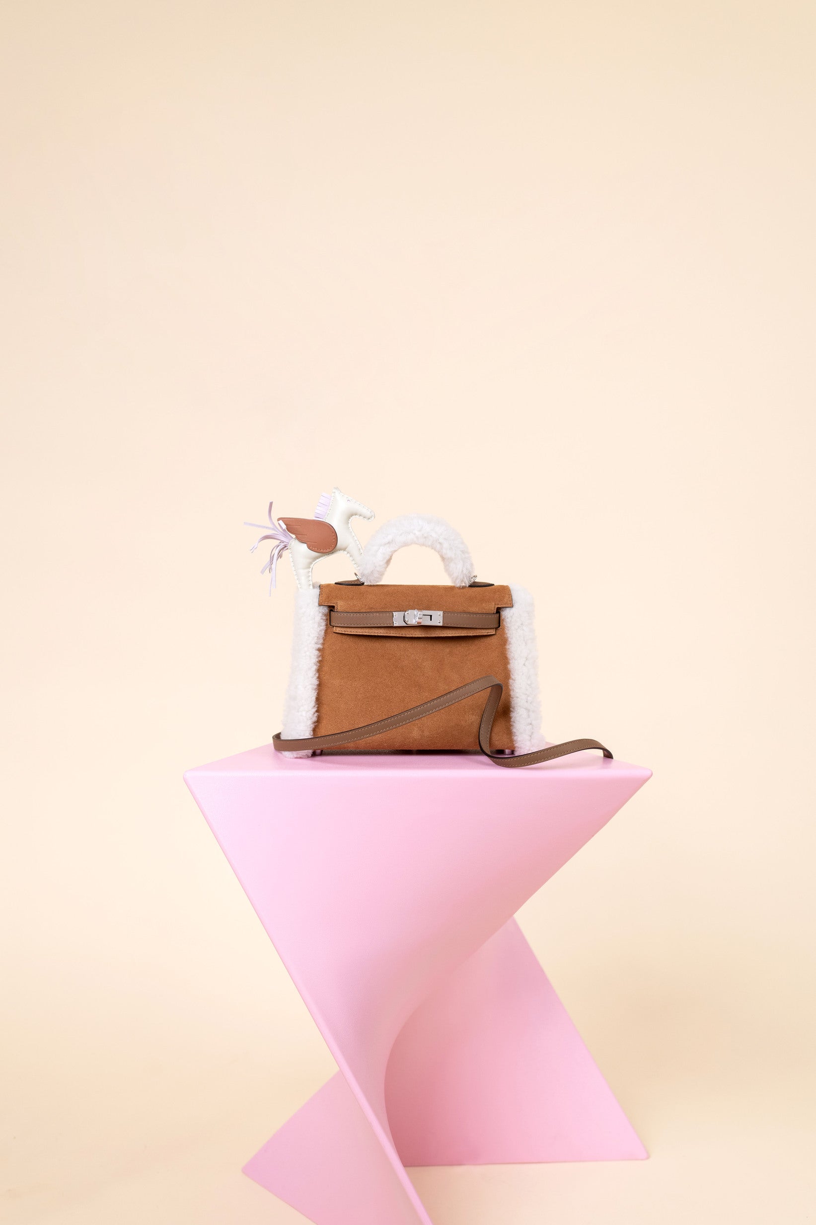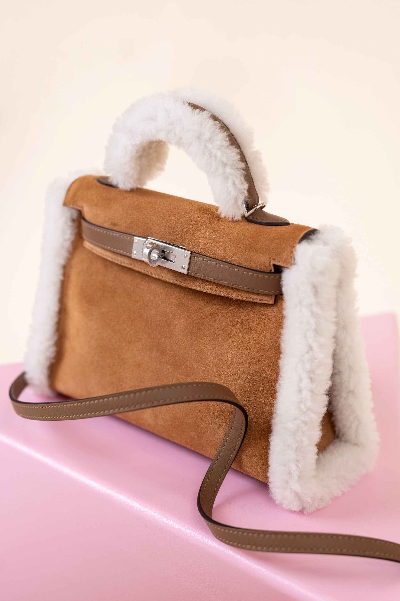 هيرميس ميني كيلي 20 جريزلي شيرلينج بلون الشامواه/اللون البيج مع PHW