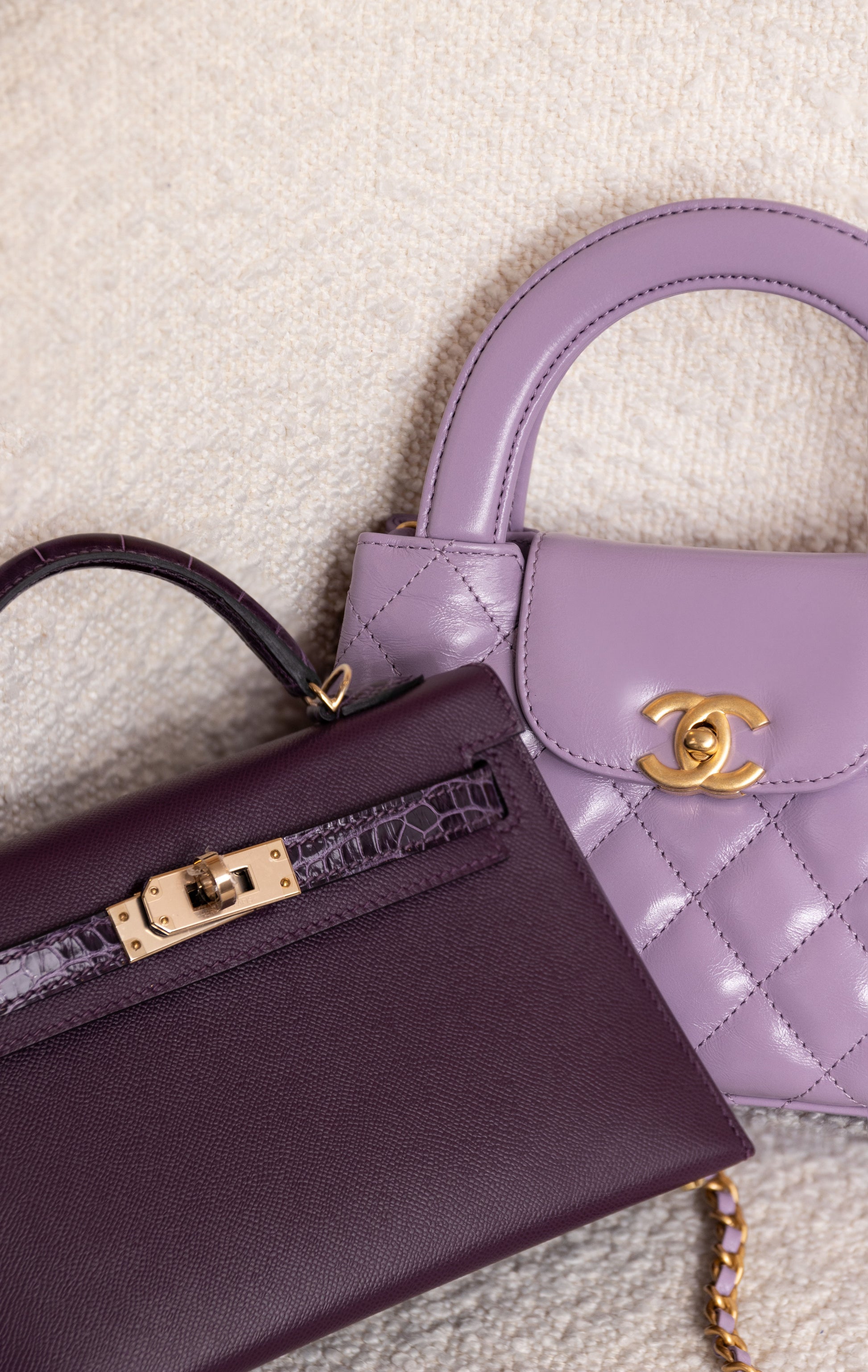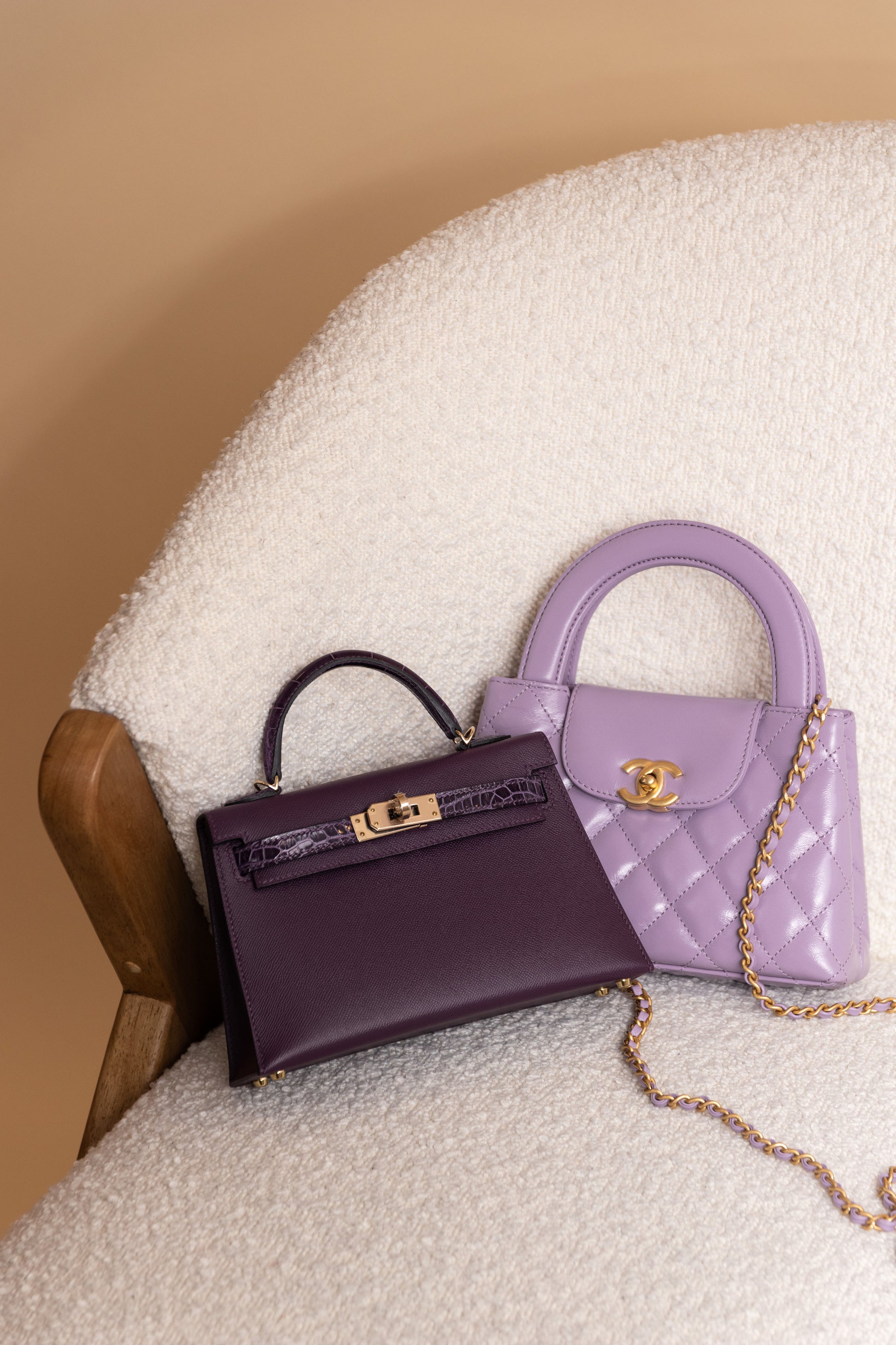 حقيبة هيرمس ميني كيلي تاتش أليجاتور كاسيس PBHW وشانيل نانو صغيرة بنفسجية