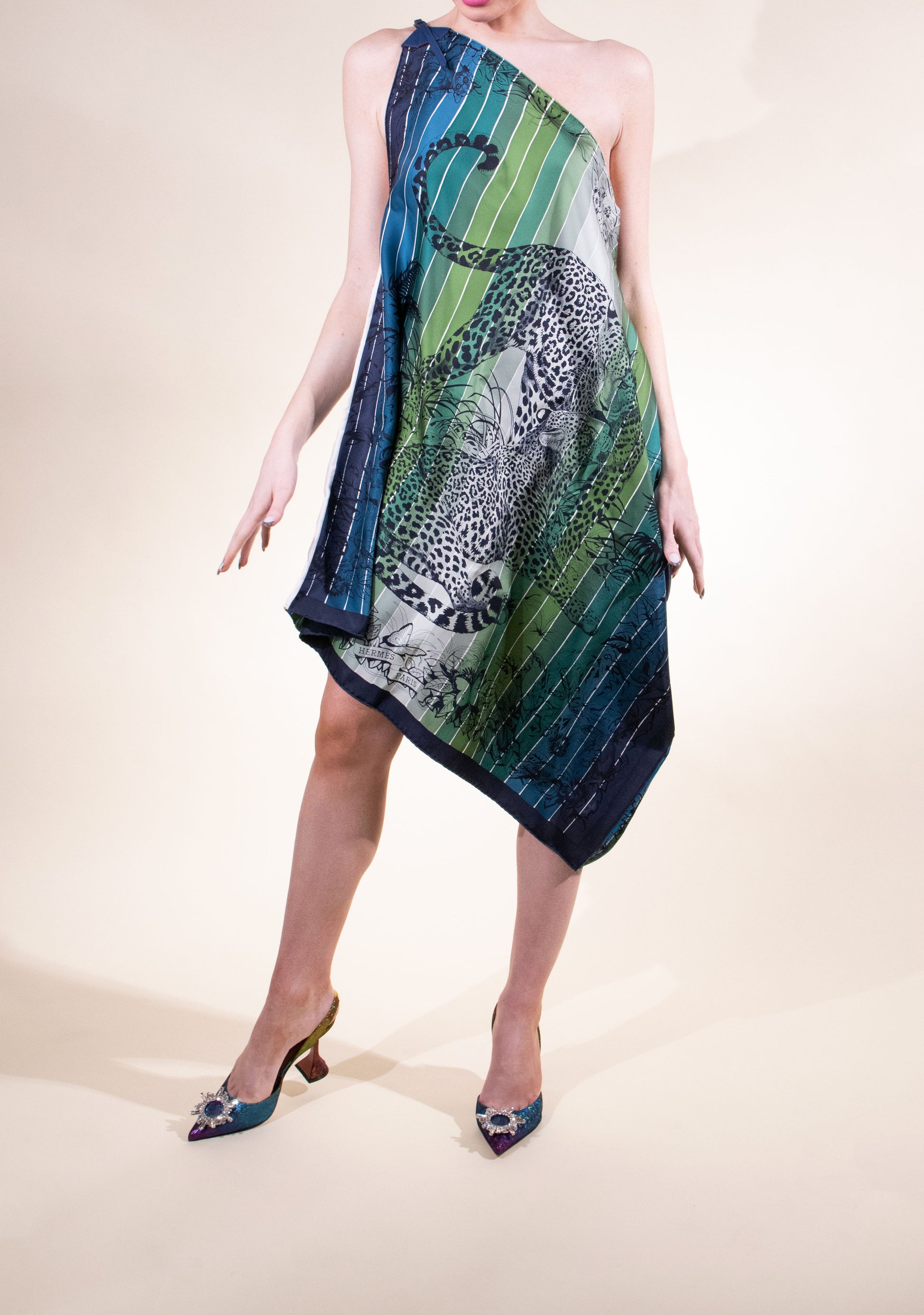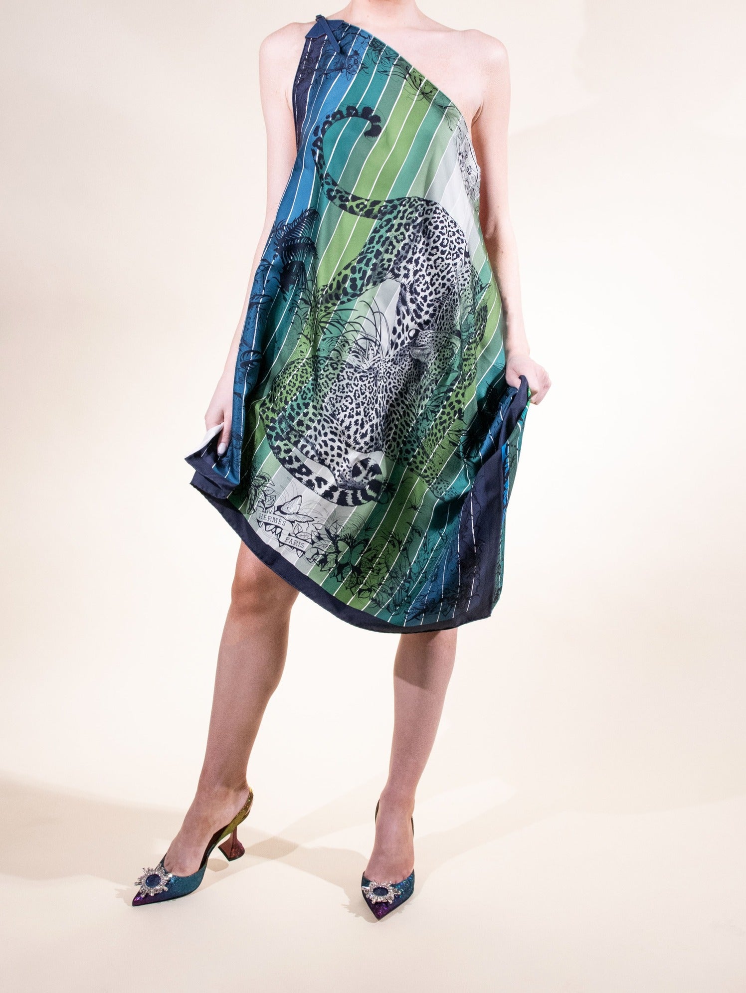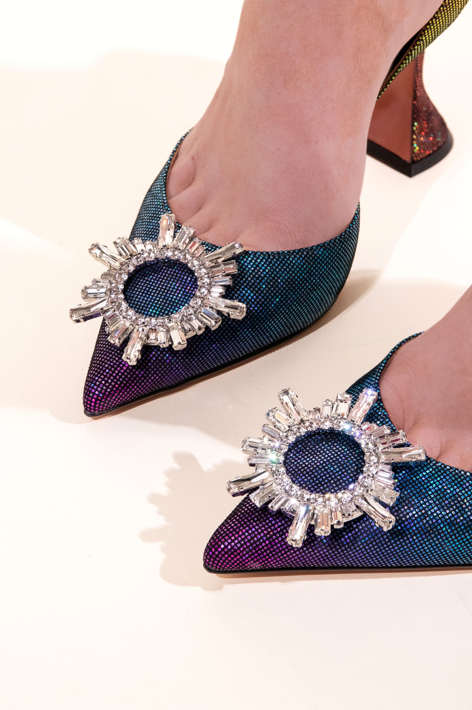 فستان حرير هيرميس بيتي إتش متعدد الألوان مع حذاء مفتوح من الخلف من أمينة معادي مرصع بكريستال قوس قزح