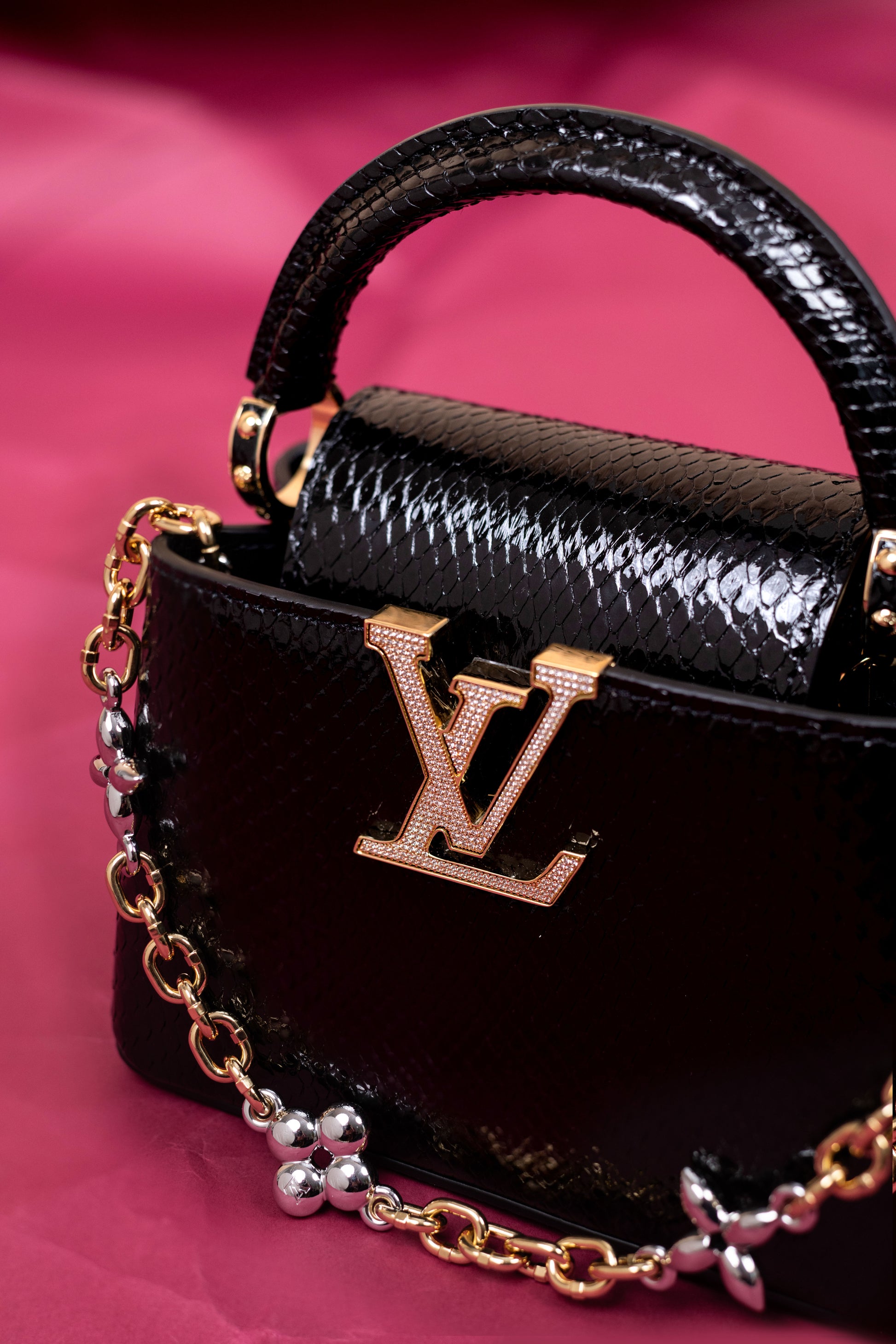 حقيبة لويس فيتون ميني كابوسين لامعة من جلد الثعبان الأسود مع سلسلة