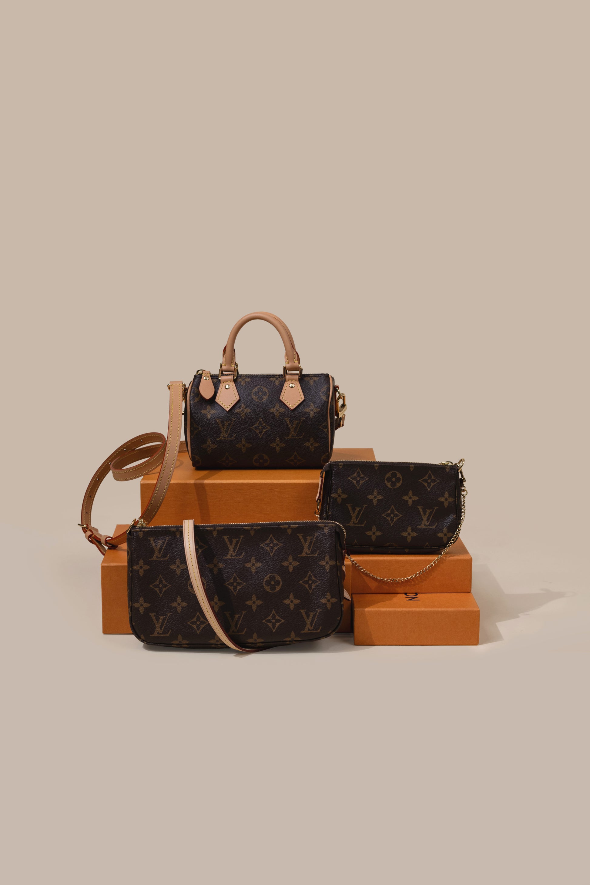 حقيبة لويس فيتون نانو سبيدي، وحقيبة صغيرة مونوغرام، وحقيبة بوشيت مونوغرام