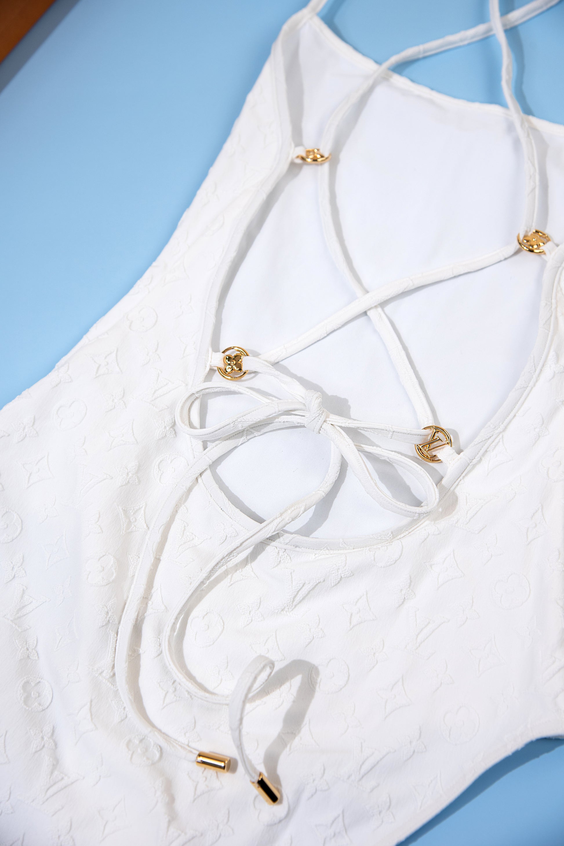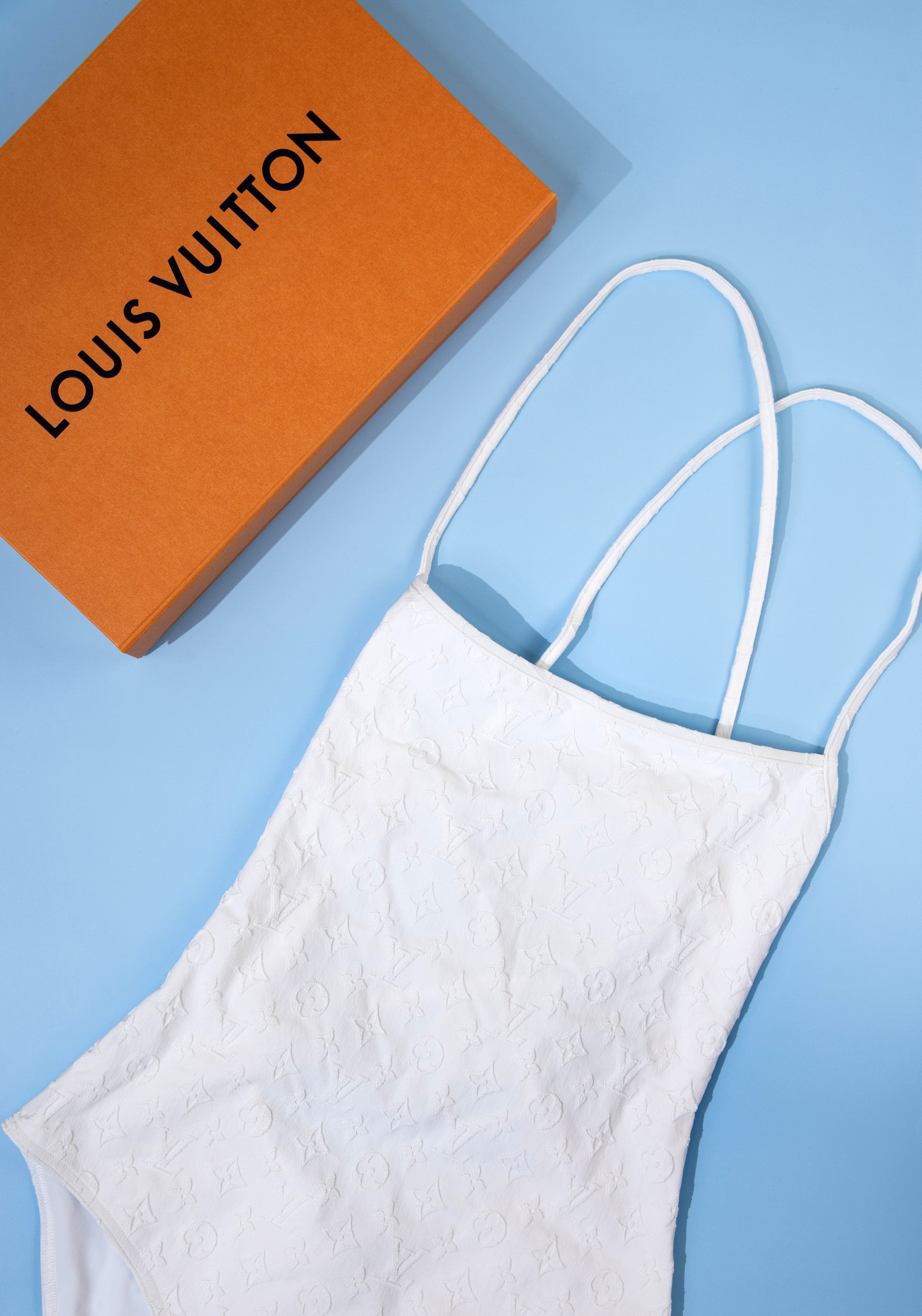 بدلة سباحة من قطعة واحدة من Louis Vuitton باللون الأبيض بنقشة الجاكار