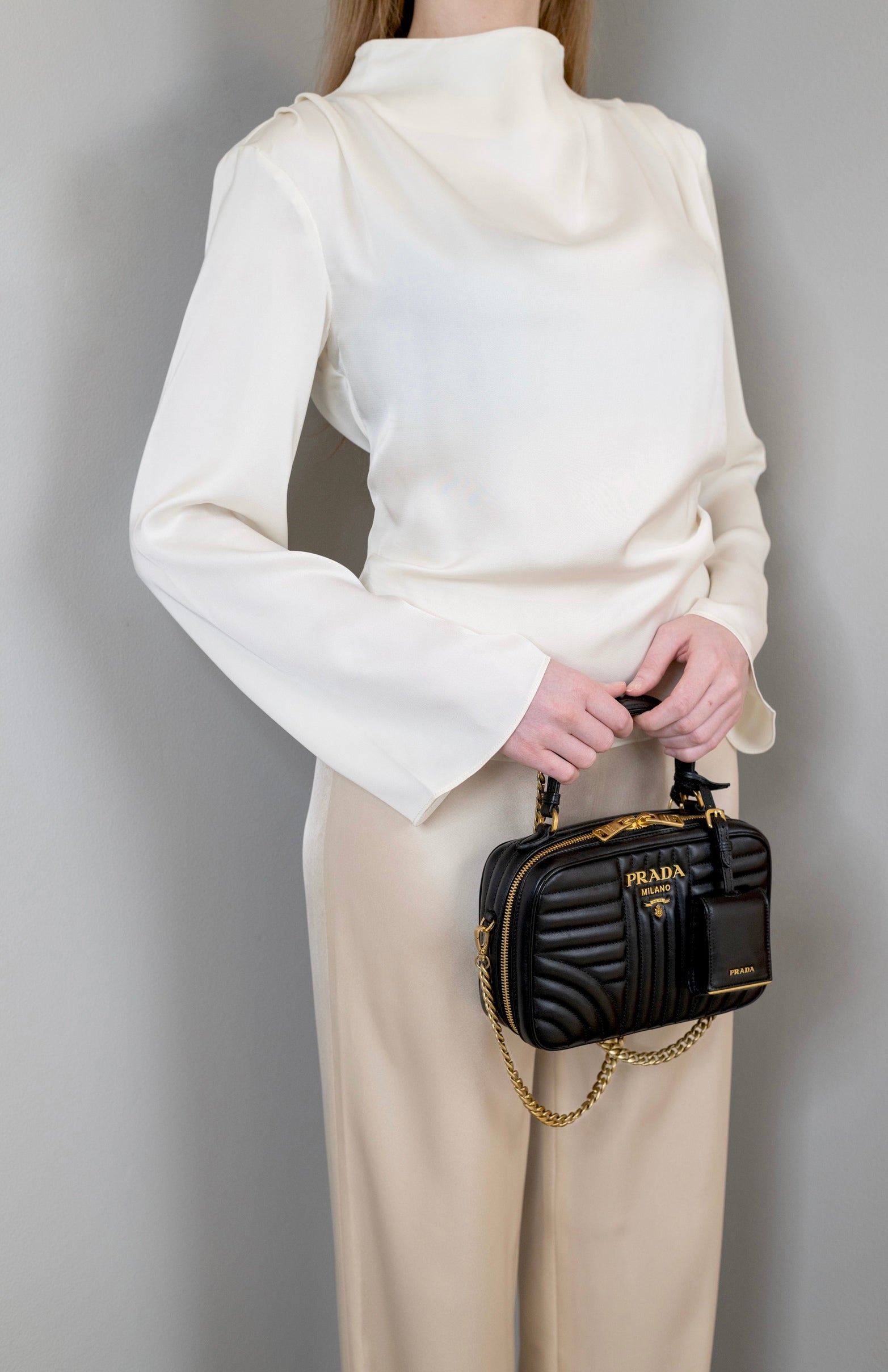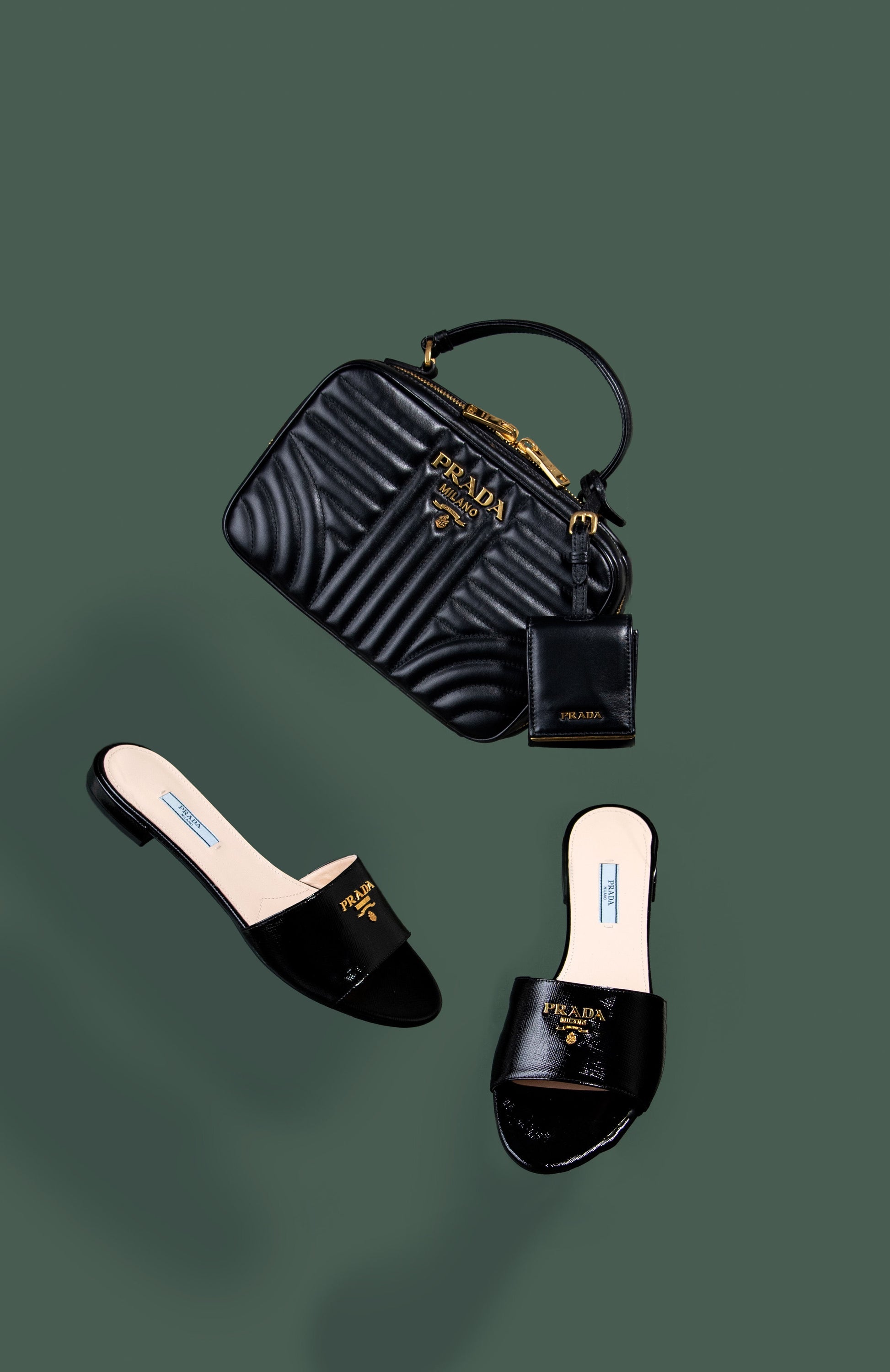 برادا - حقيبة جلدية سوداء مبطنة بمقبض علوي مع صندل أسود/ذهبي