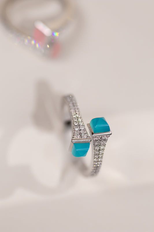 Marli Cleo White Gold Diamond Rings in Blue Chalcedony, Pink Quartzite, & Moonstone