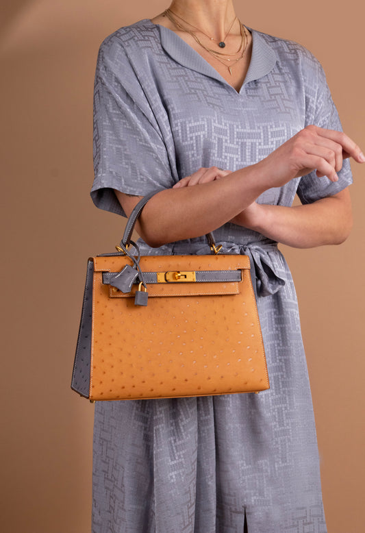 Hermès HSS Kelly 28 Ostrich in Saffron/Gris Agate GHW