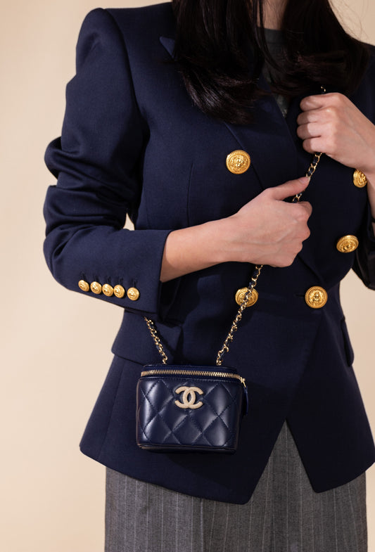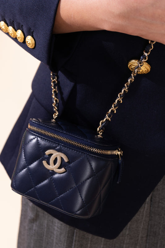 Chanel "Charming Buttons" Navy Vanity Case with Chain