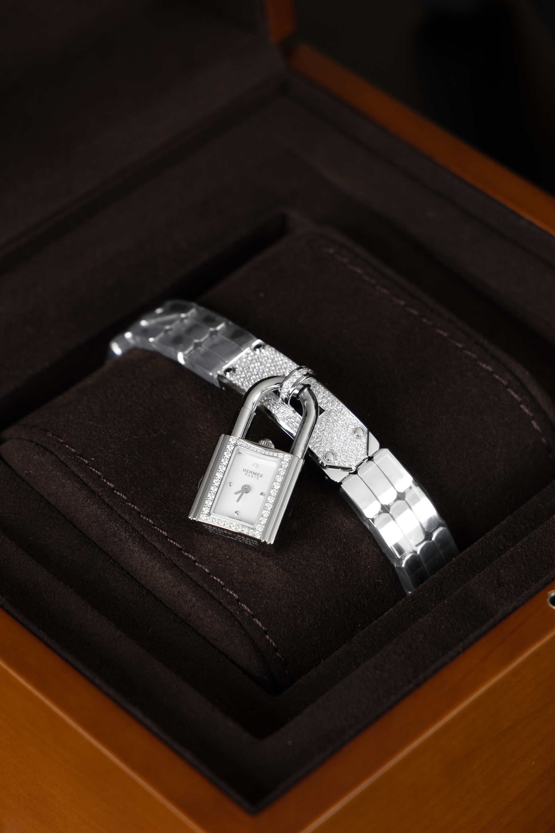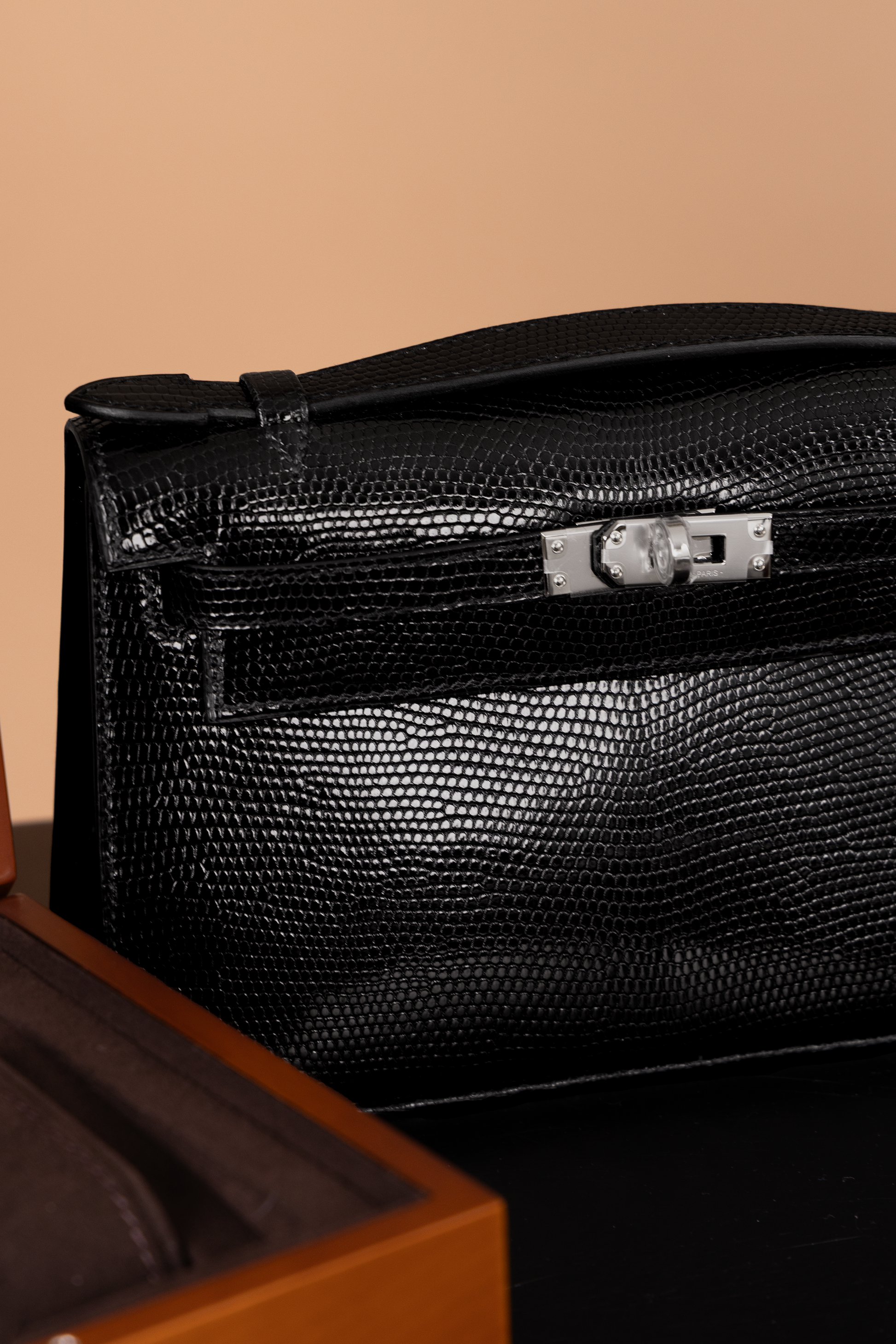 Costarellos Jacey Embroidered Tulle Faux Leather Gown with Hermès Kelly Pochette Black Lizard, Chanel Black Mesh Flower Pumps & Hermès Kelly Watch