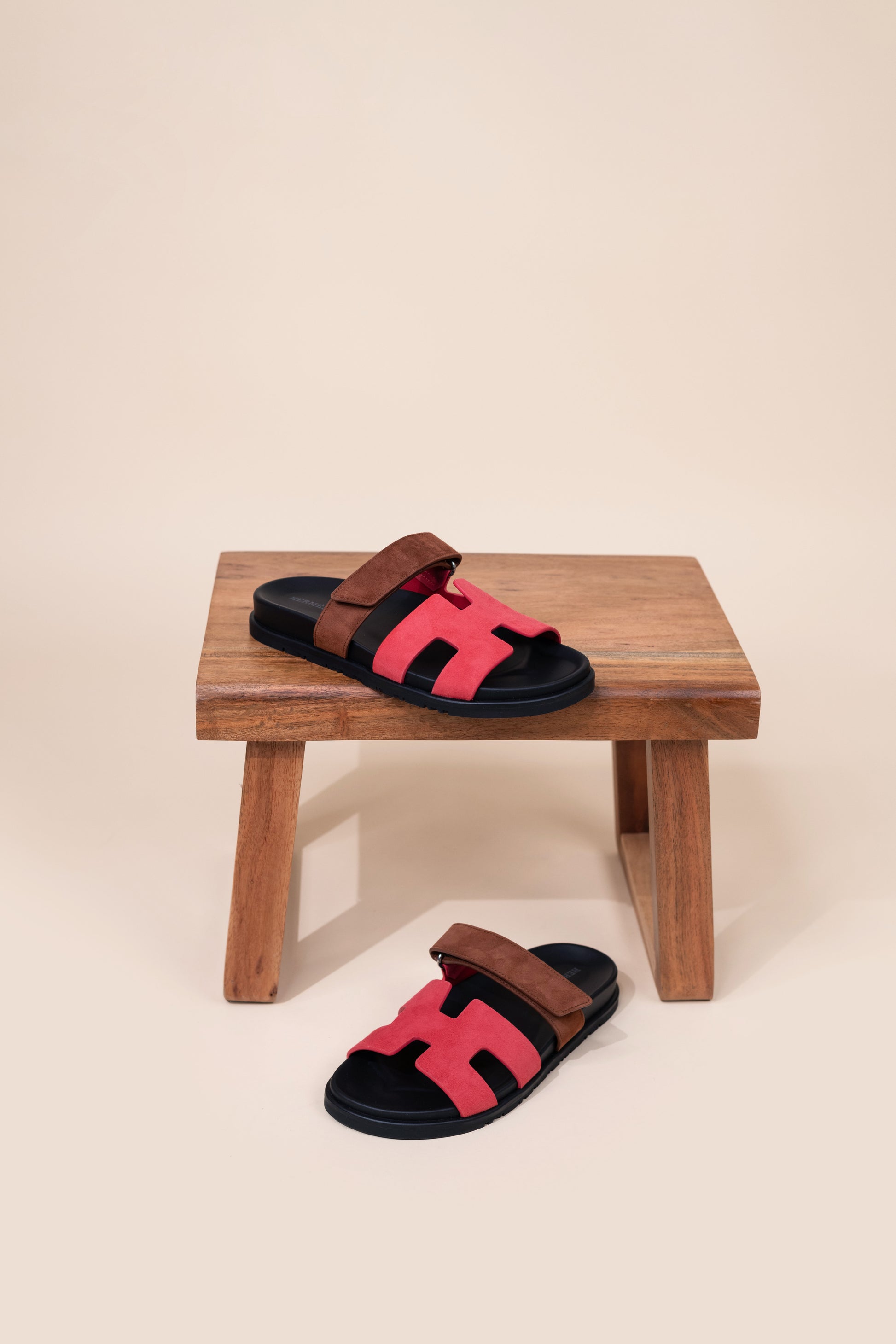 Hermès Chypre Suede Sandals in Rouge Cinétique/Gold
