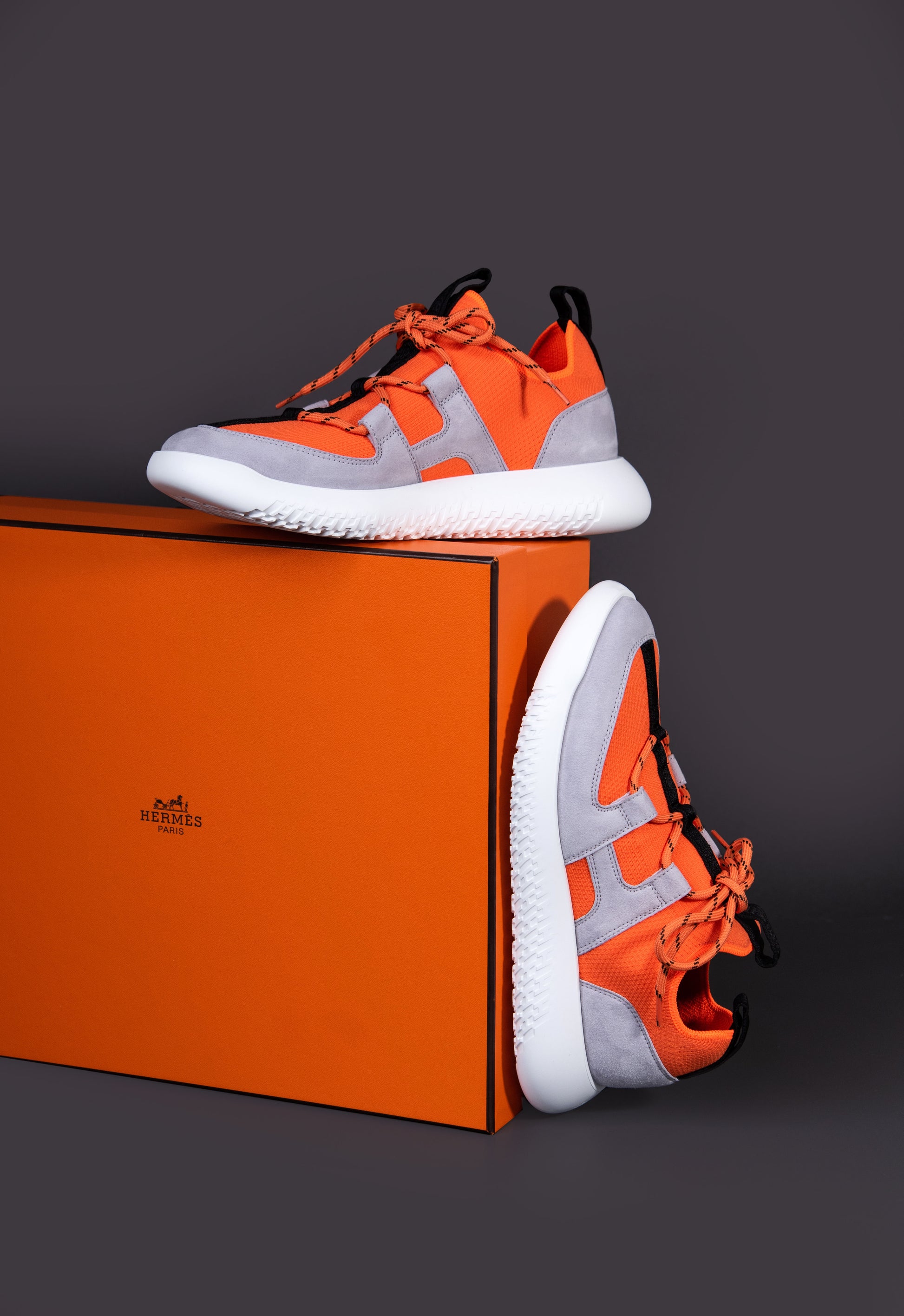 Hermès - Duel Velvet Goatskin Knit Sneakers in Multicolor Orange