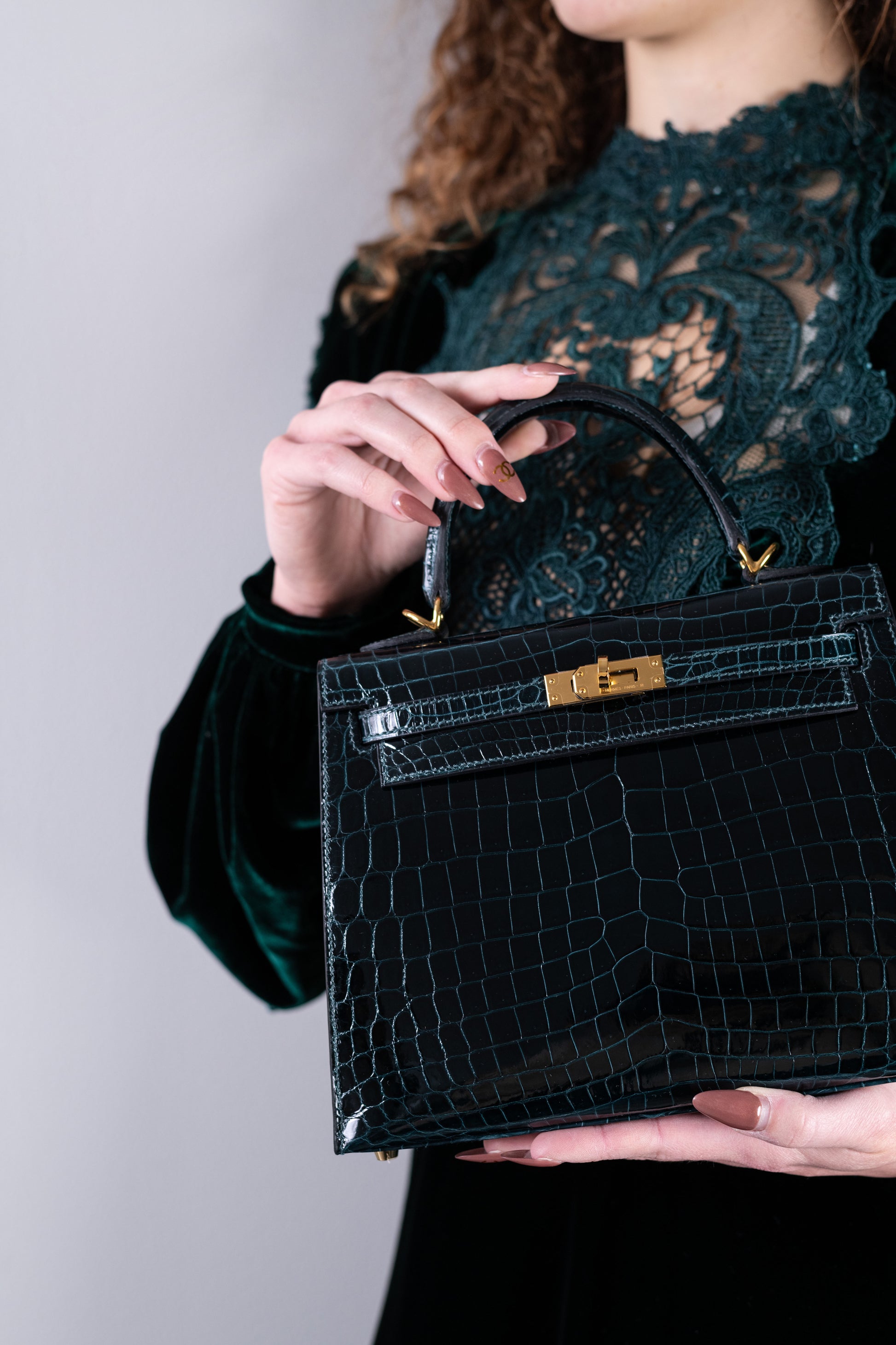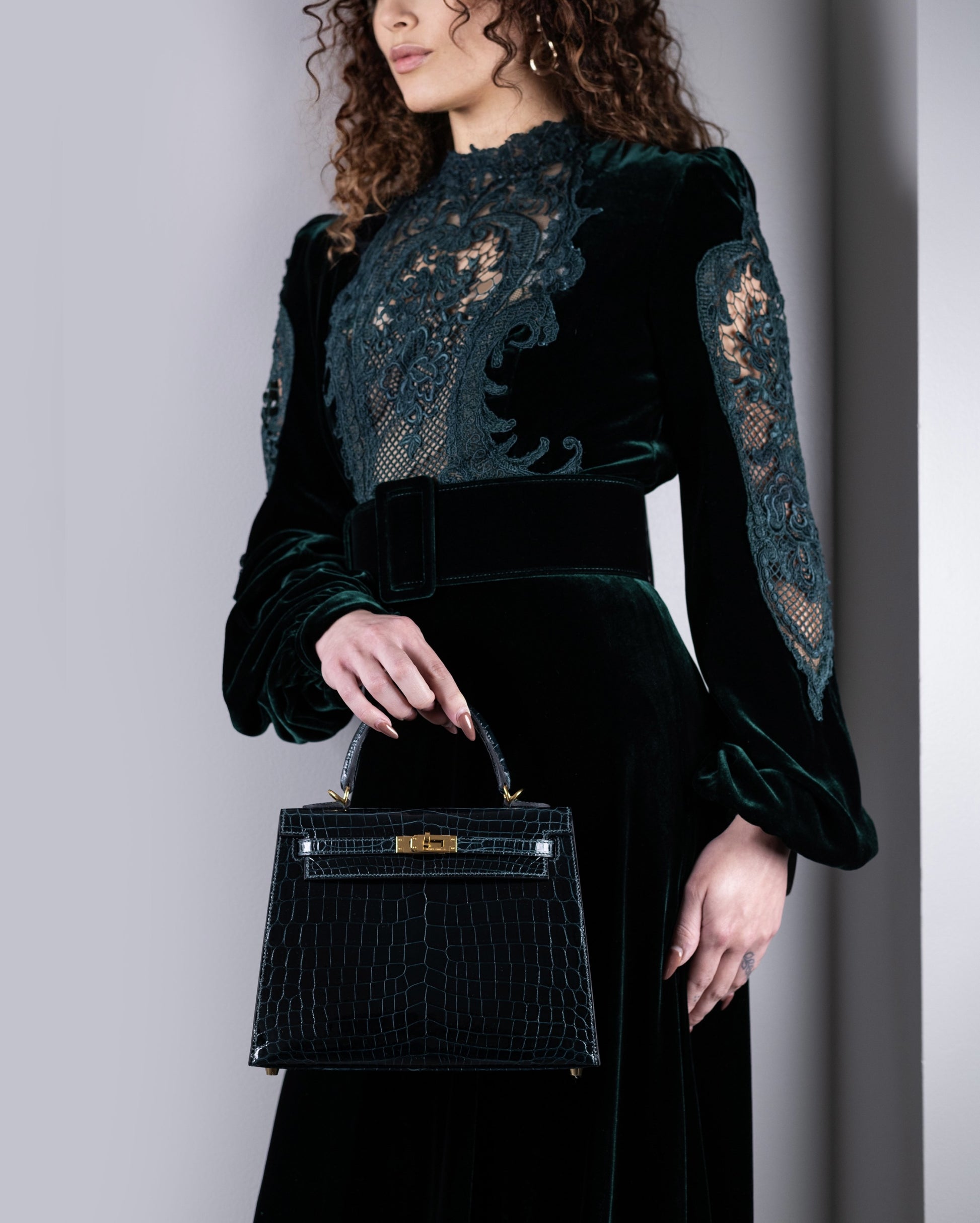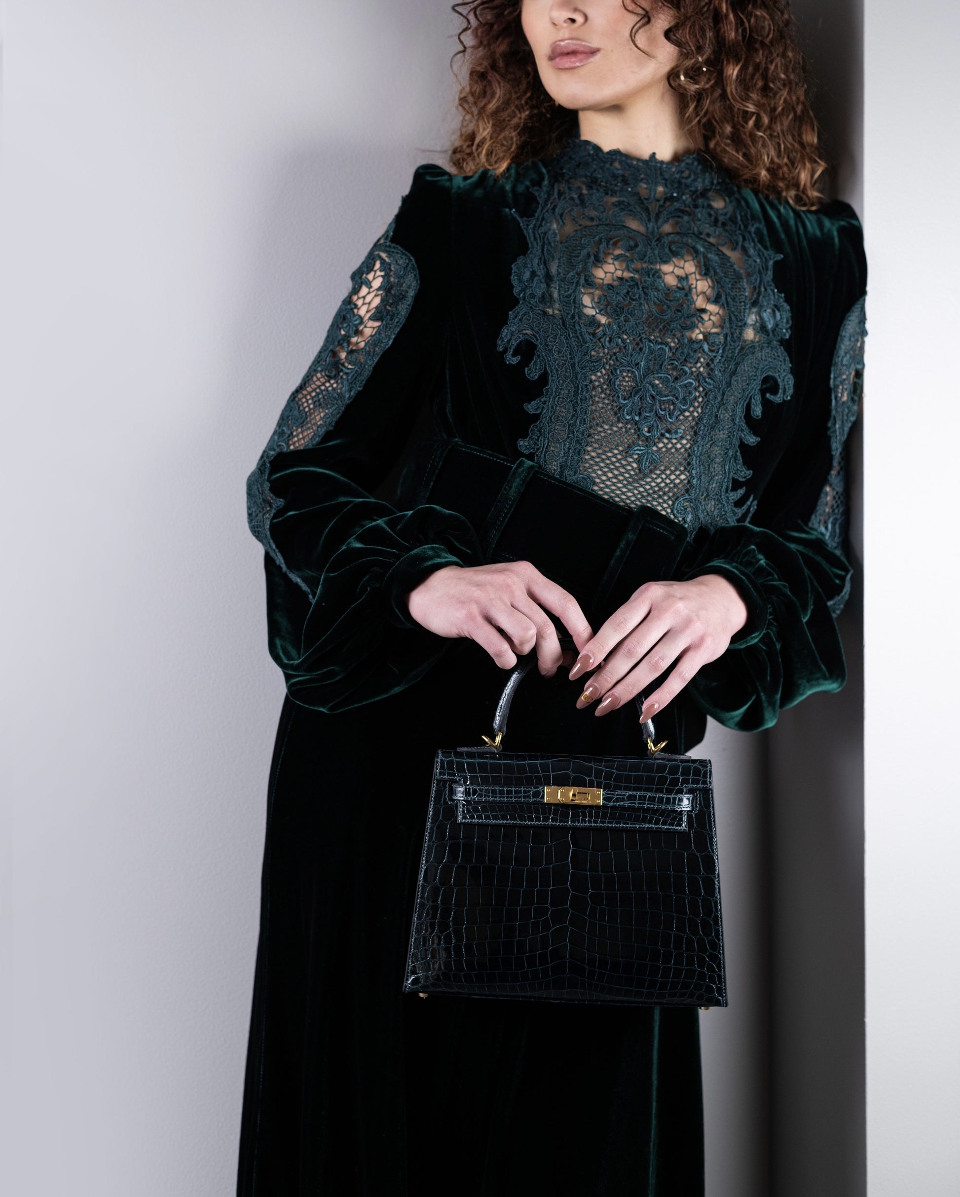 Hermès Kelly 25 Shiny Crocodile Vert Cypress with Costarellos Dark Green Velvet Gown