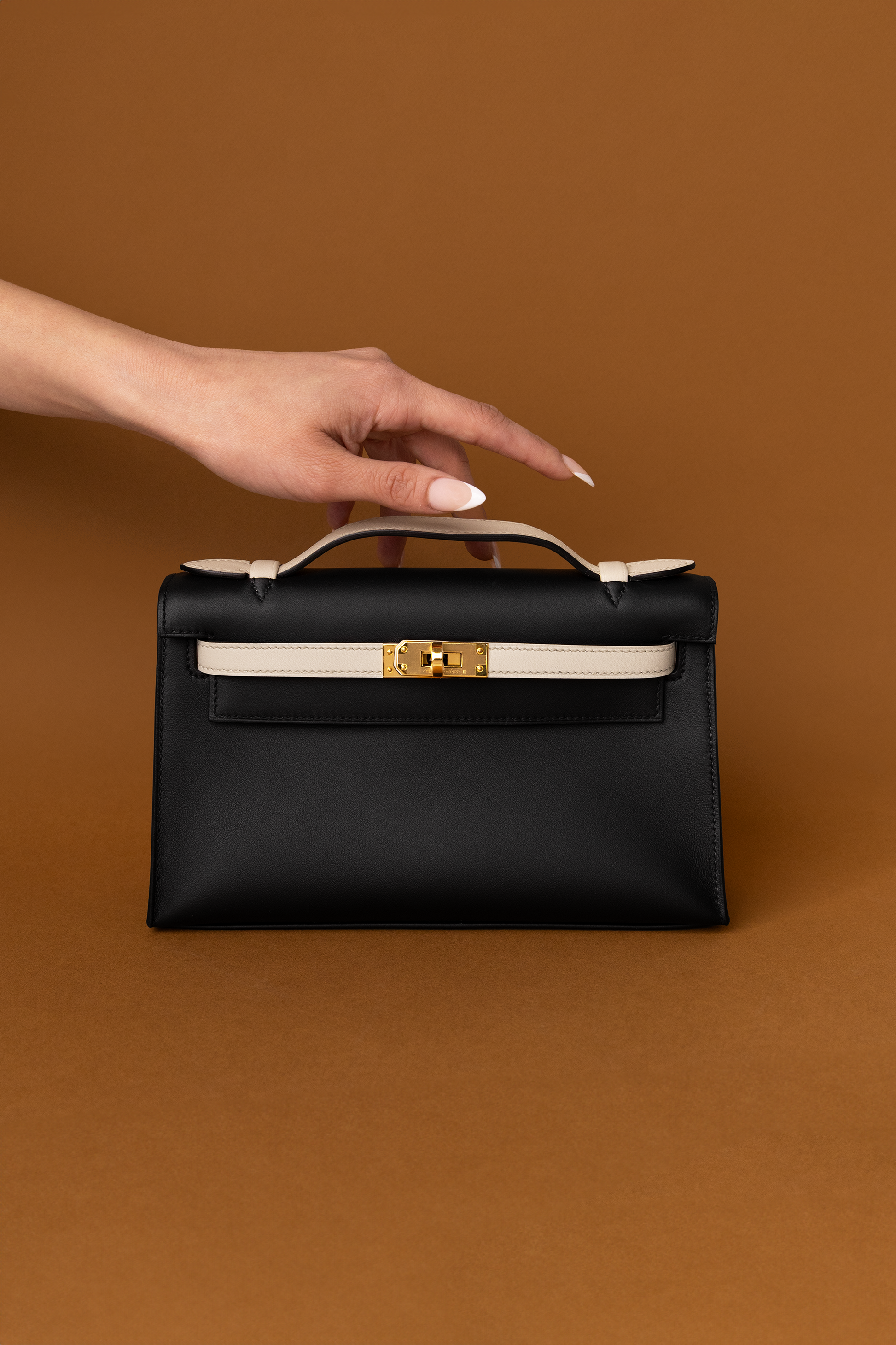 Hermès Kelly Pochette Swift in Black/Nata GHW