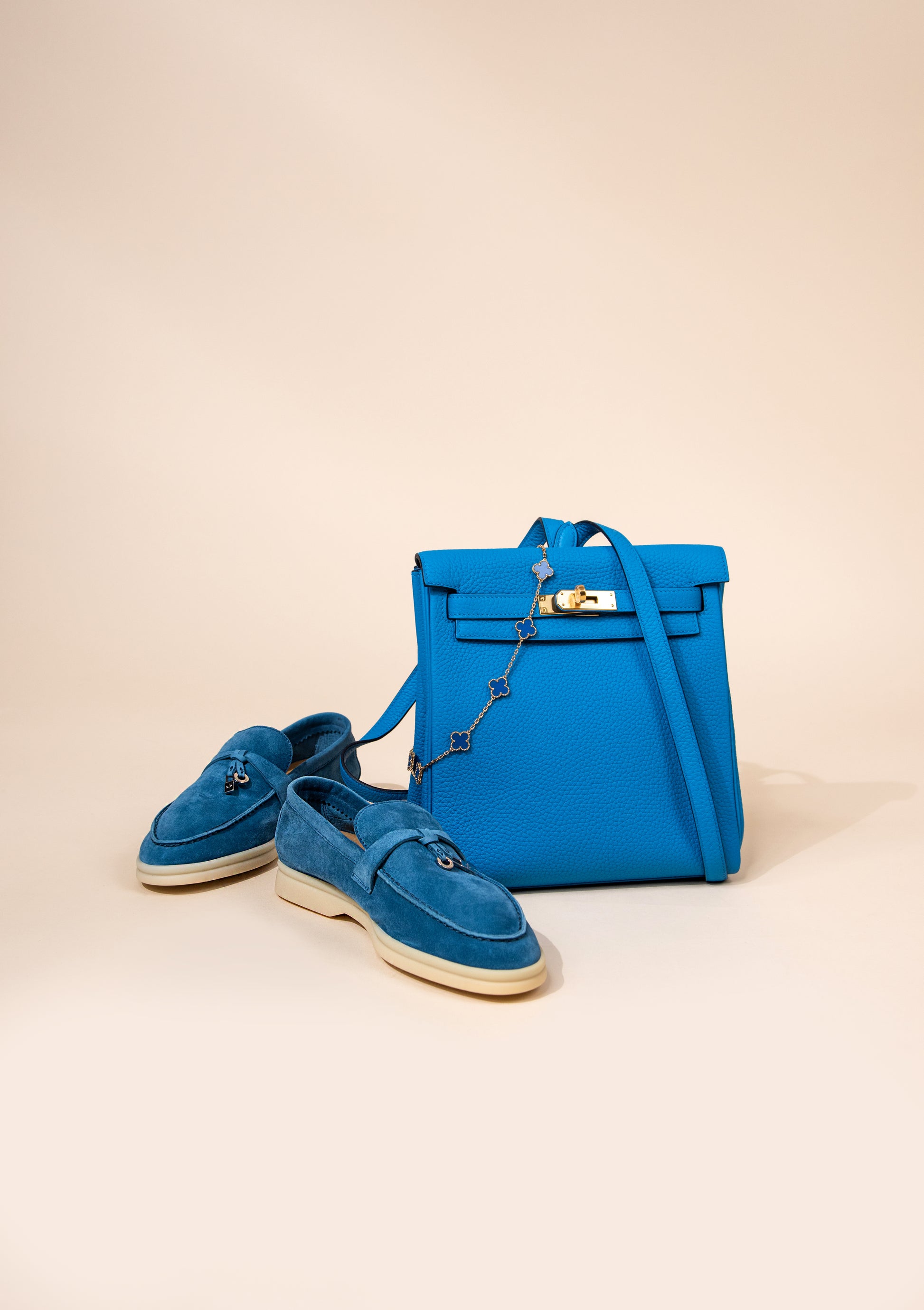 Hermès Kellyado Bag in Blue Frida GHW with Loro Piana Blue Loafers