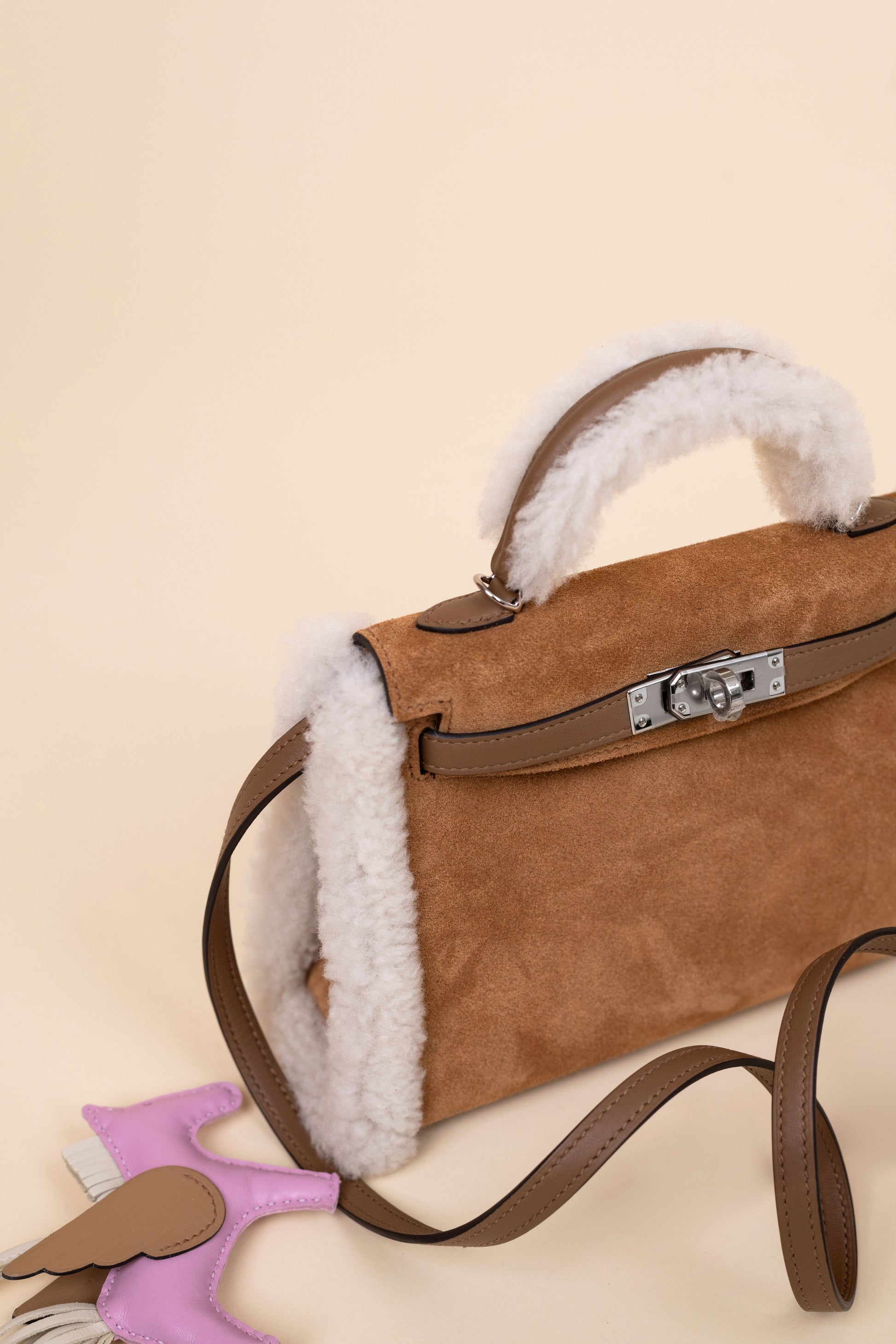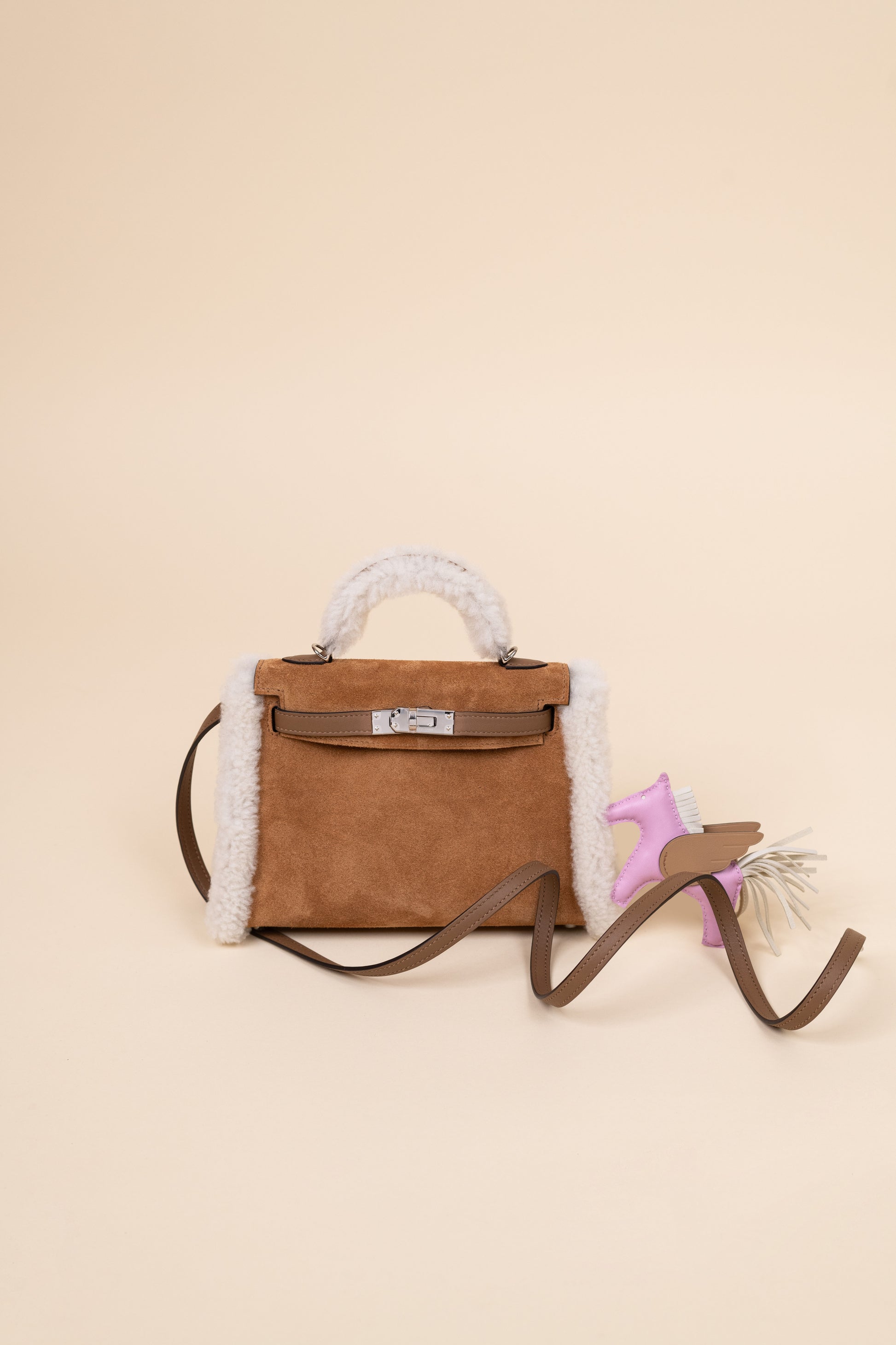 Hermès Mini Kelly 20 Grizzly Shearling in Chamois/Ecru with PHW