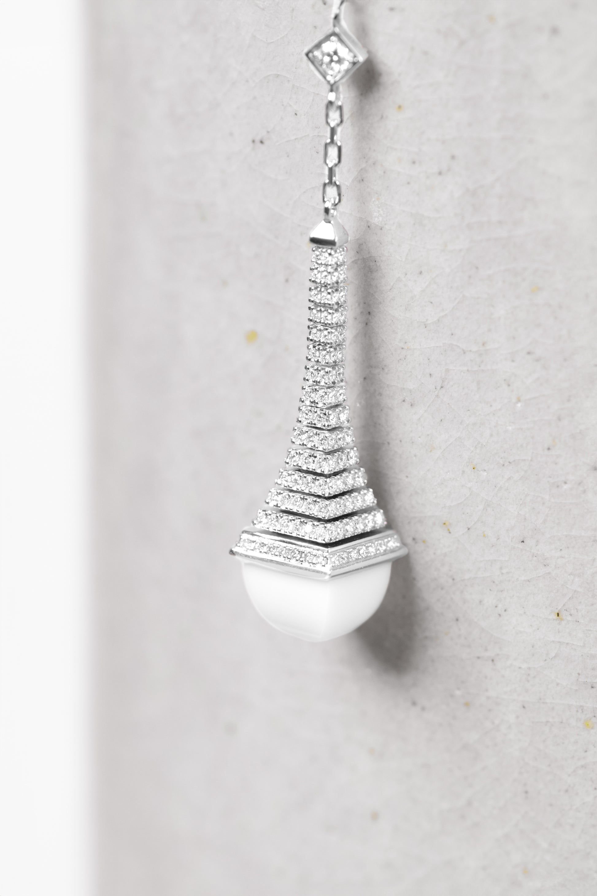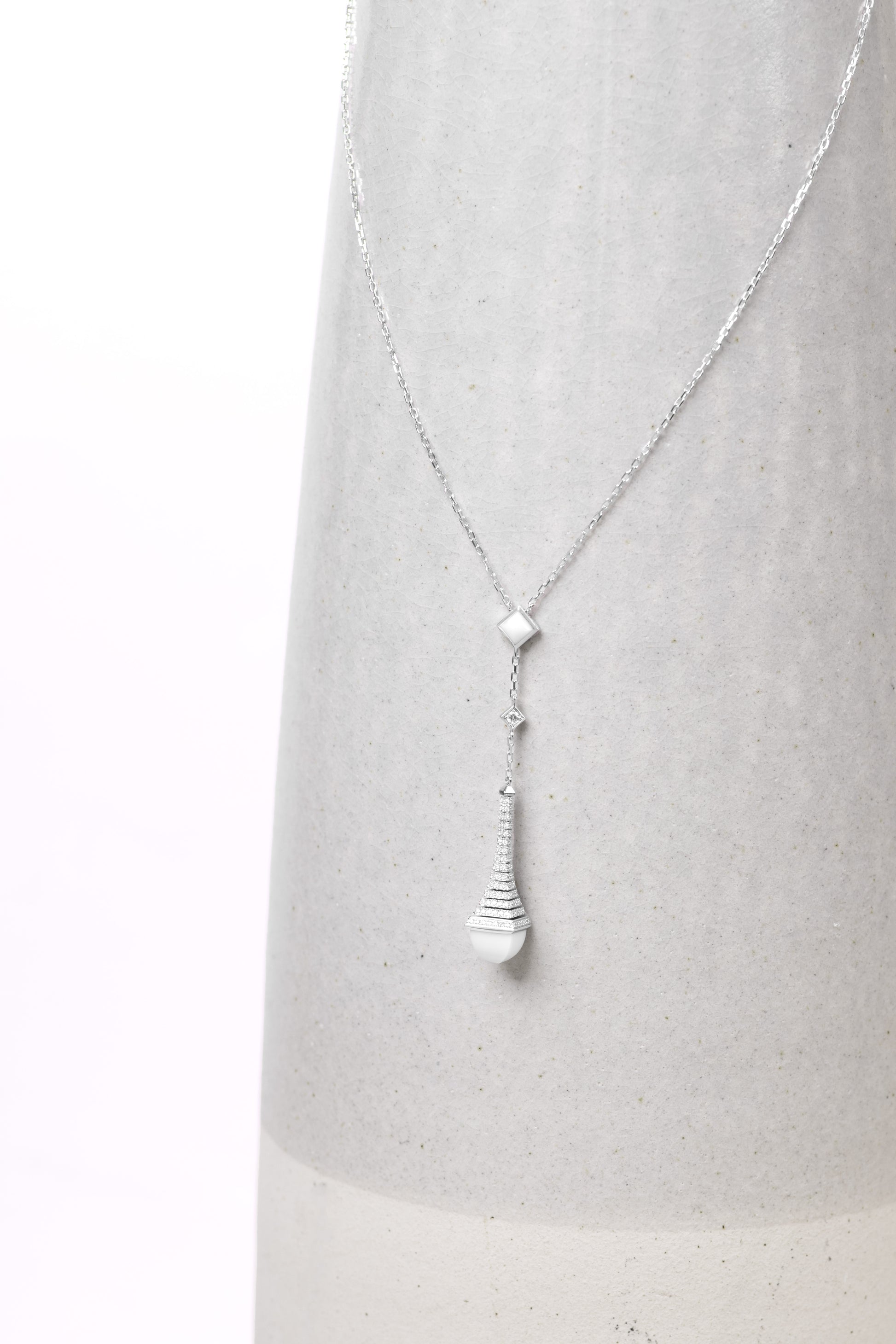Marli Cleo Rev White Gold Diamond/White Agate Long Chain Drop Pendant Necklace