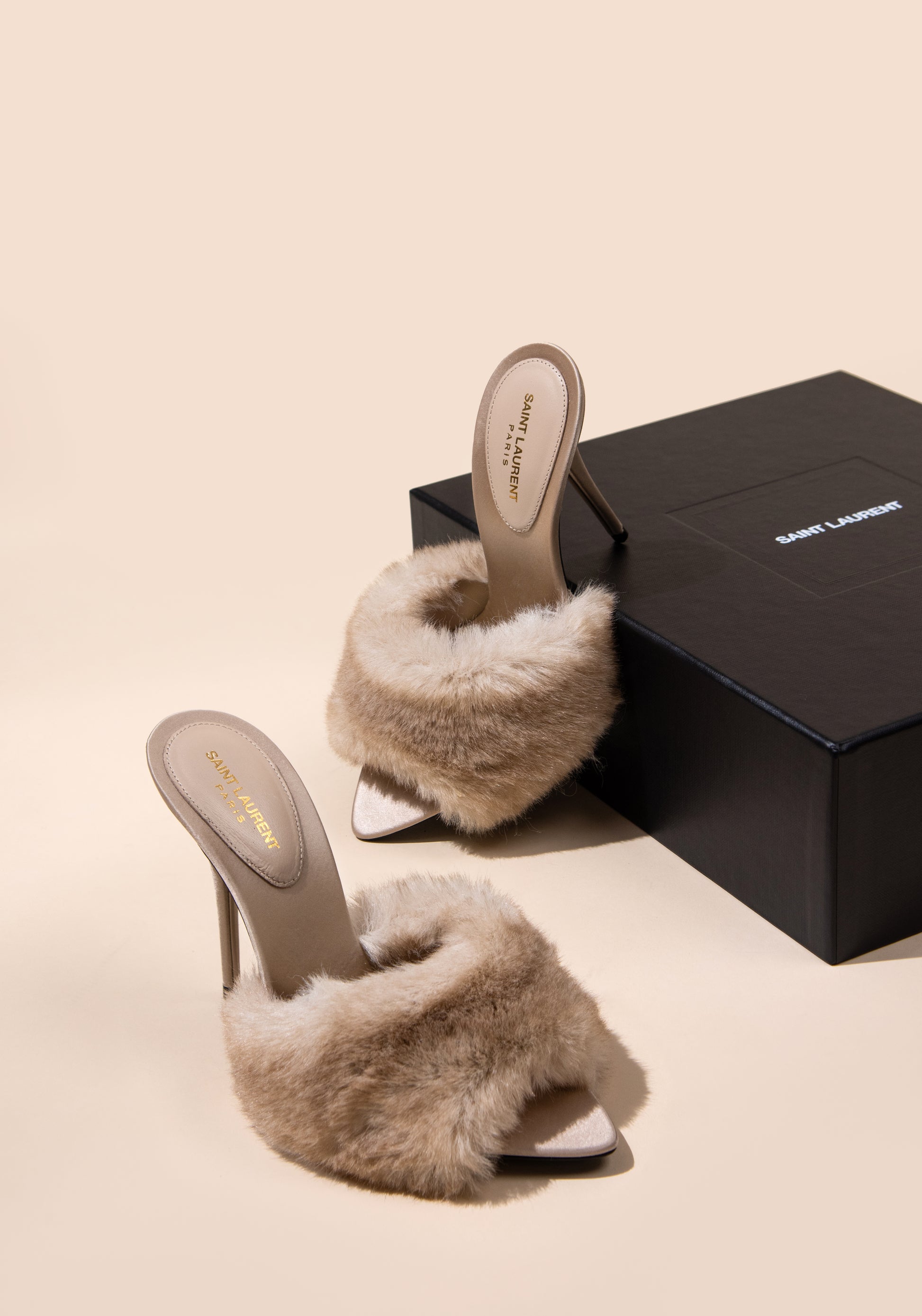 Saint Laurent Gippy Faux Fur Mule Sandals in Light Beige